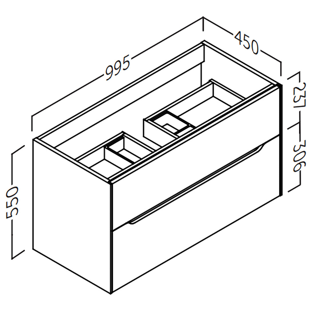 Kommoden har en dold upphängning som är både höjd- och djupjusterbar, vilket gör det lätt att få till en snygg och stabil montering. För rengöring rekommenderas vanligt rengöringsmedel och en ren, mjuk trasa.