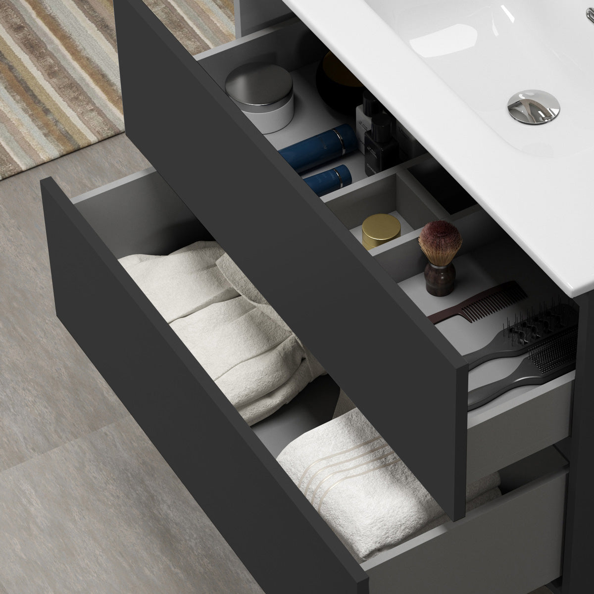 Kommoden levereras utan tvättställ, vilket gör det till en flexibel lösning då man kan välja mellan flera olika tvättställ som passar just ditt badrum, och din livsstil.