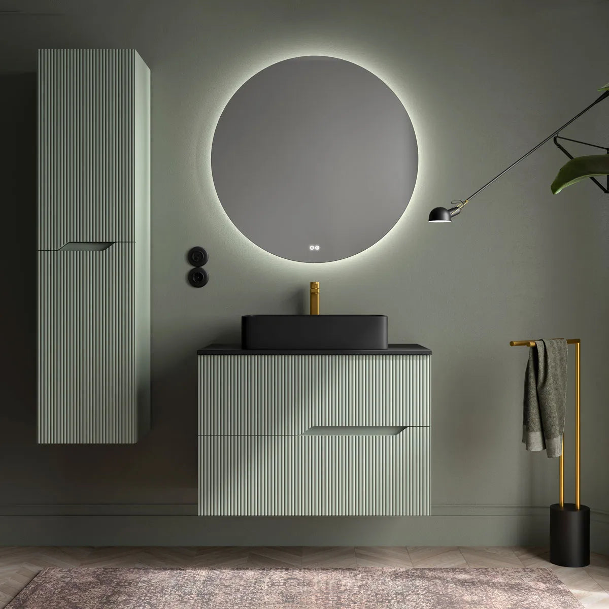 För att ge en svävande och minimalistisk känsla har kommoden dold upphängning, vilket skapar ett rent och avskalat intryck där golvytan frigörs. Denna designfunktion ger badrummet ett luftigare uttryck och gör det dessutom lättare att städa under möbeln.