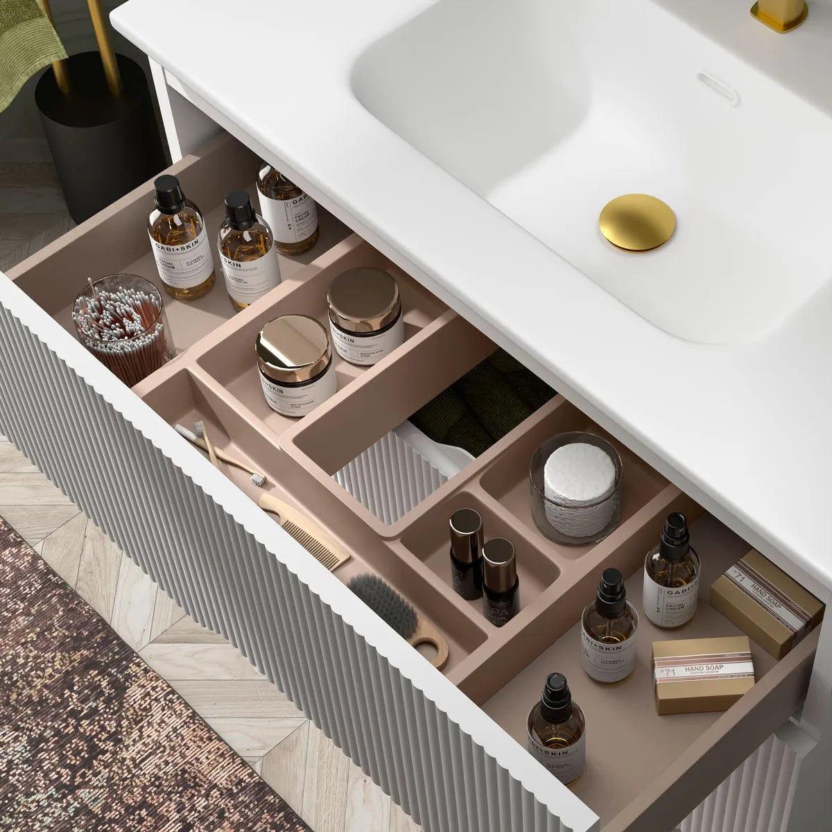 Materialet i kommoden är laminerad MDF, vilket gör den hållbar och motståndskraftig mot fukt, något som är särskilt viktigt i badrumsmiljöer. Lådfronterna är lackerad MDF vilket ger en snygg och slitstark yta. Lådorna har mjukstängande mekanismer, vilket gör att de stängs tyst och mjukt, vilket bidrar till en känsla av lyx.