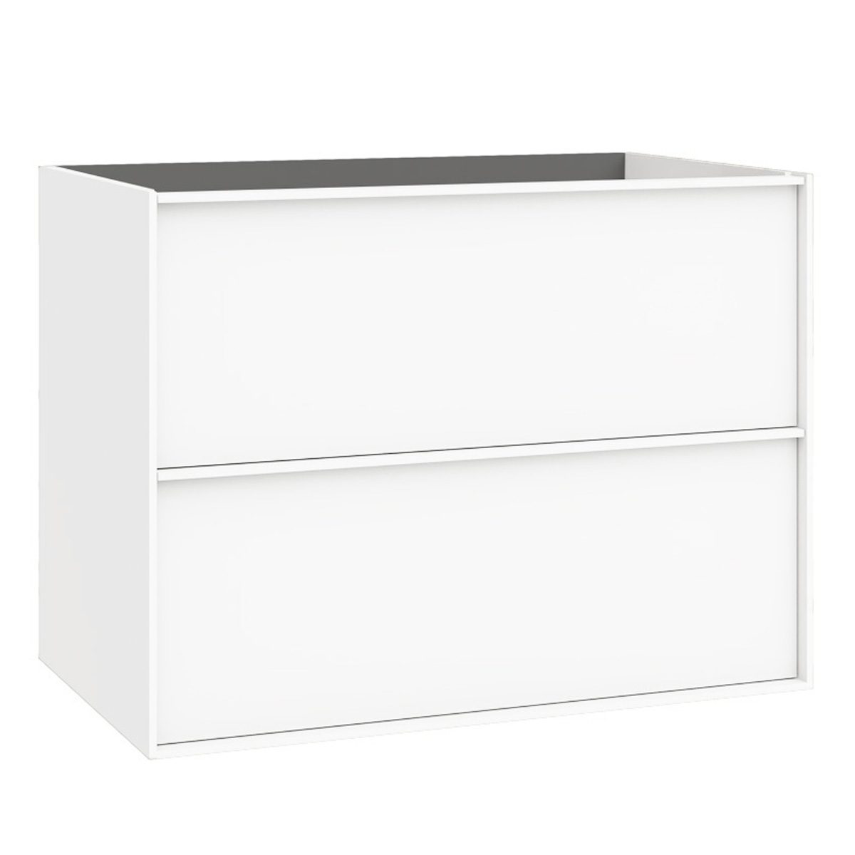 Kommoderna i serien finns i två bredder, 60 cm och 80 cm, vilket ger flexibilitet för olika badrumsstorlekar. Med ett djup på 46 cm och en höjd på 59 cm erbjuder de tillräckligt med förvaringsutrymme utan att dominera rummet. De är utrustade med två rymliga lådor med mjukstängande mekanismer, vilket gör dem både praktiska och tystgående. Lådornas greppkanter, tillverkade i samma material och finish som resten av möbeln, bidrar till en enhetlig och modern look.