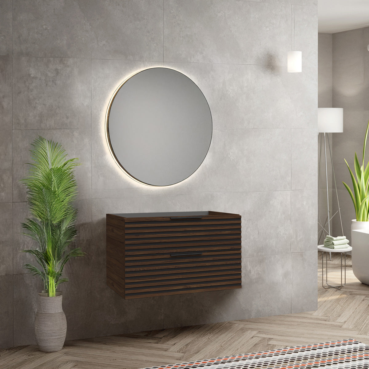 Tenfors Stilja i 80 cm är en stilren badrumskommod/tvättställsskåp i en varm valnötsnyans. Fronten har en distinkt lamellstruktur: svart MDF-bas med horisontella lameller i valnöt som ger djup och rytm åt möbeln. Två fullt utdragbara lådor med GRASS-skenor och sidor av metall, ger mjuk, tyst och kontrollerad stängning, medan praktiska småfack i översta lådan håller ordning på vardagens småsaker. Den dolda upphängningen är justerbar i höjden och djupet och det säkra upphängningssystemet gör monteringen enkel och säker. Svarta metallhandtag kompletterar formspråket.