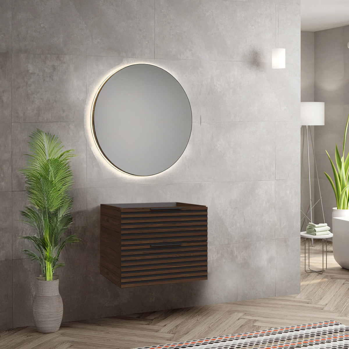 Tenfors Stilja i 60 cm är en stilren badrumskommod/tvättställsskåp i en varm valnötsnyans. Fronten har en distinkt lamellstruktur: svart MDF-bas med horisontella lameller i valnöt som ger djup och rytm åt möbeln. Två fullt utdragbara lådor med GRASS-skenor och sidor av metall, ger mjuk, tyst och kontrollerad stängning, medan praktiska småfack i översta lådan håller ordning på vardagens småsaker. Den dolda upphängningen är justerbar i höjden och djupet och det säkra upphängningssystemet gör monteringen enkel och säker. Svarta metallhandtag kompletterar formspråket.