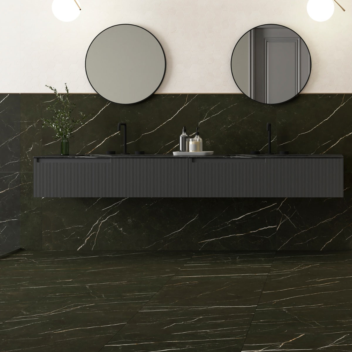 Med rektifierade kanter möjliggör Klinker Elite Black Marmor Matt användningen av smalare fogar, så tunna som 1 mm. Detta ger inte bara en modern och stilren estetik utan också en jämnare och mer enhetlig yta. Den smala fogningen ger också möjlighet att framhäva det eleganta mönstret och skapa en känsla av oavbruten kontinuitet.