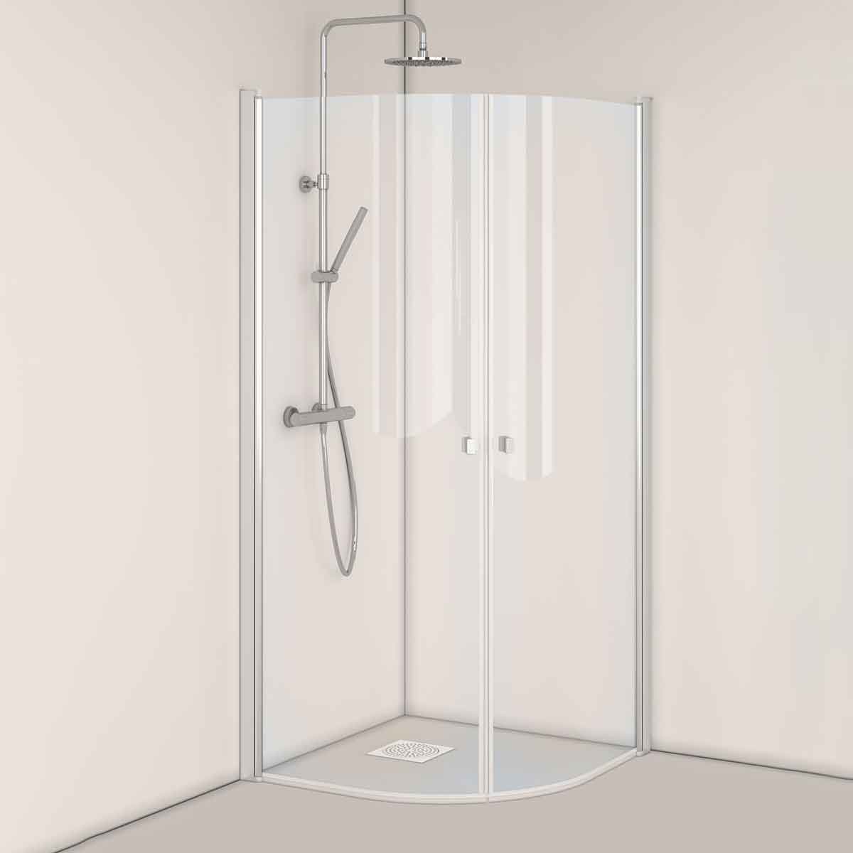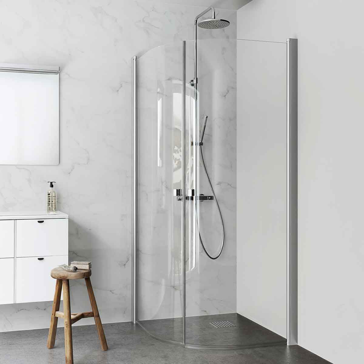 De böjda dörrarna i 6 mm härdat säkerhetsglas ger ett mjukt och stilrent uttryck. När duschen inte används kan dörrarna fällas in mot väggen, vilket frigör golvyta och ger ett mer öppet och harmoniskt badrum. Väggprofiler i anodiserad aluminium bidrar till stabilitet och en tidlös finish som passar de flesta inredningsstilar.
