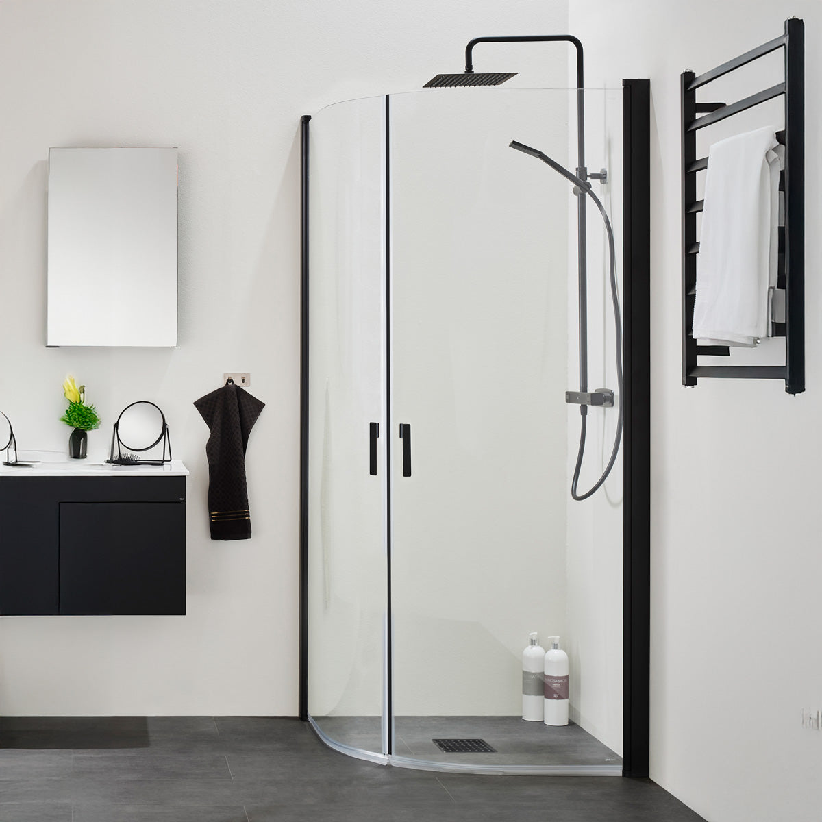 De böjda dörrarna i 6 mm härdat säkerhetsglas skapar ett mjukt och exklusivt uttryck. När duschen inte används kan dörrarna vinklas in mot väggen, vilket frigör golvyta och ger ett mer öppet och harmoniskt badrum. Väggprofiler i svartlackerad aluminium ger stabilitet och en stilren kontrast som förstärker det moderna intrycket.