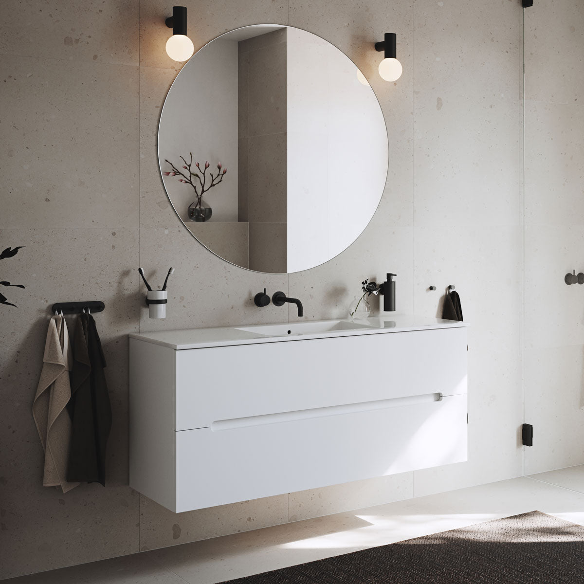 Badrumsserien HOME kännetecknas av skandinavisk formgivning där enkelhet, funktion och kvalitet samverkar. En elegant fyrkrok i svart matt som kombinerar modern estetik med slitstark konstruktion – perfekt för ett stilrent och välorganiserat badrum.
