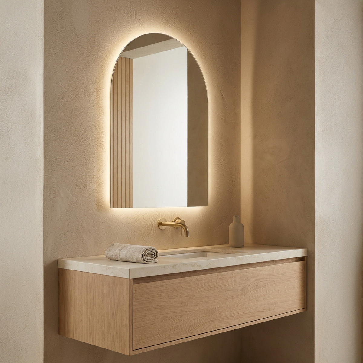- Kapellformad badrumsspegel med mjukt rundad ovandel