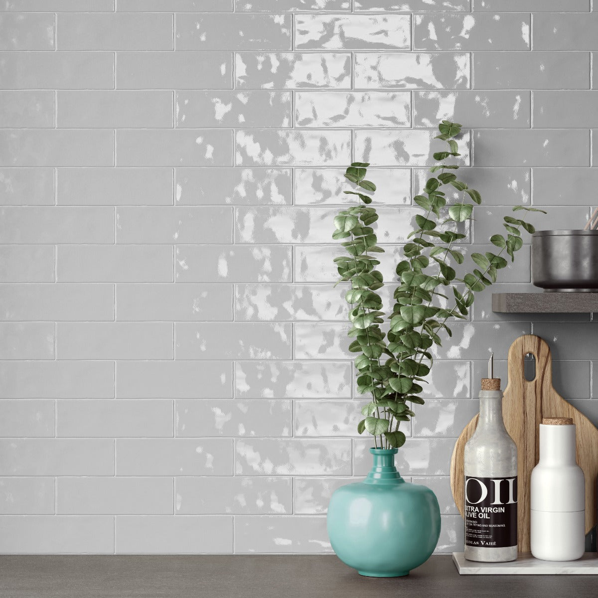 Kakel Lineo Pearl Blank 6,5x20 är en ljust grå, blank kakelplatta med rustik känsla. Ytan är högblank och plattan är varierande i både tjocklek och form vilket ger en levande och äkta känsla. Den varierande ytan återspeglar även ljus på olika sätt.