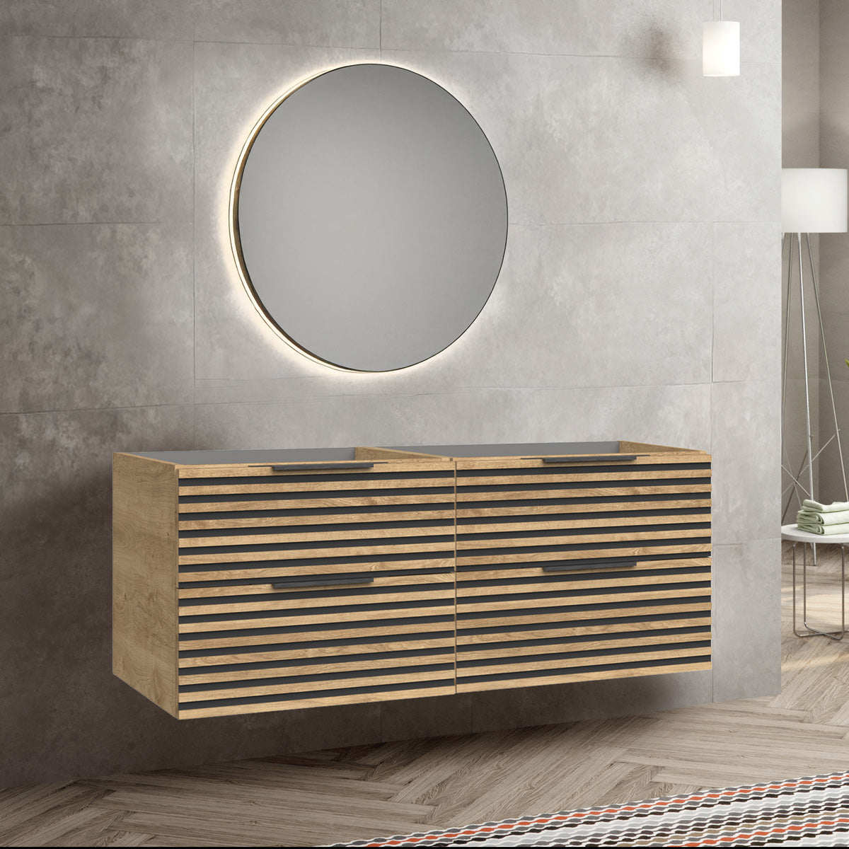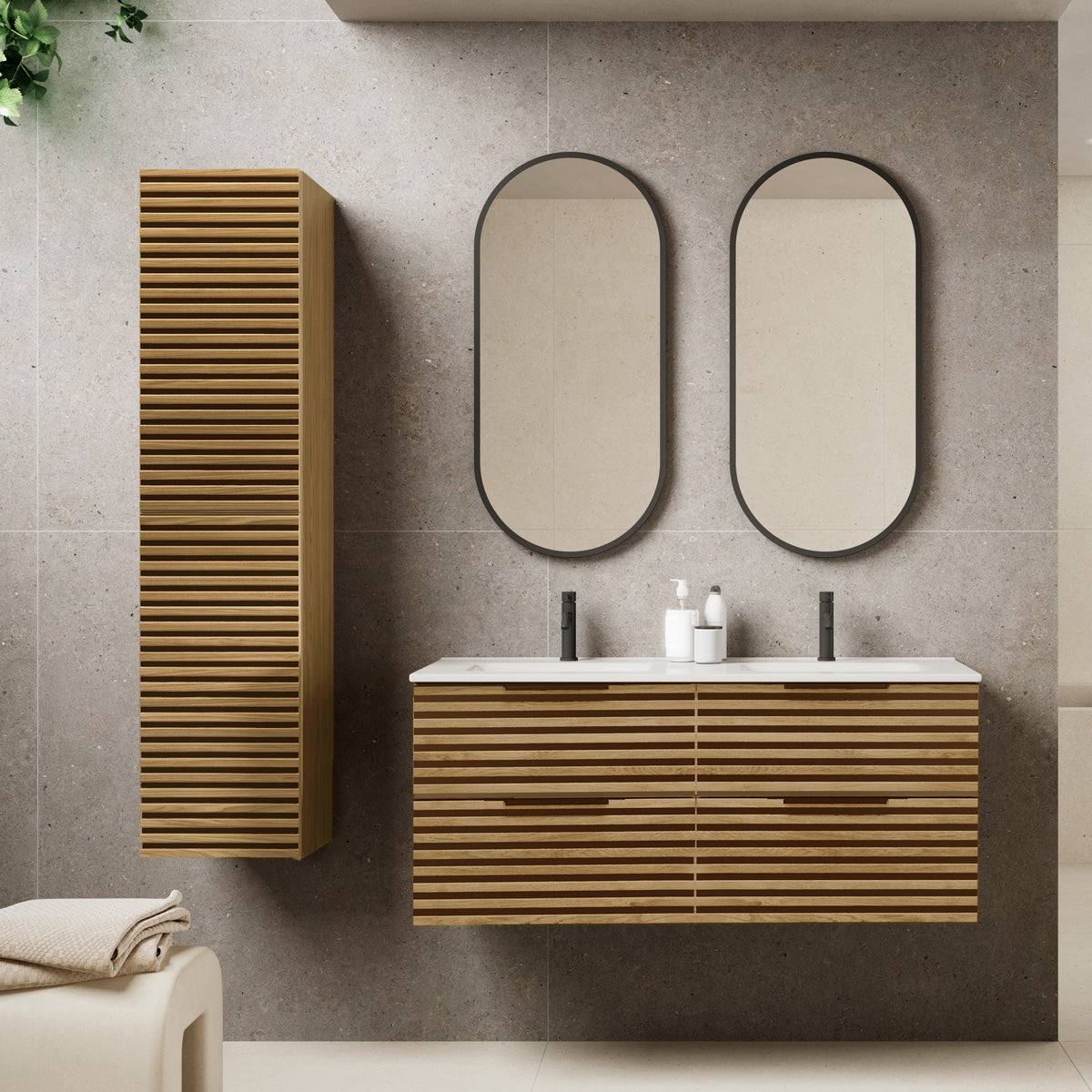 För större ytor kan du kombinera två 60 cm kommoder och toppa med ett tvättställ i 120 cm. Resultatet blir generös förvaring, symmetri och en enhetlig designlinje genom hela möbelväggen. Serien är framtagen för att fungera lika bra i kompakta badrum som i större utrymmen där du vill maximera både estetik och funktion.