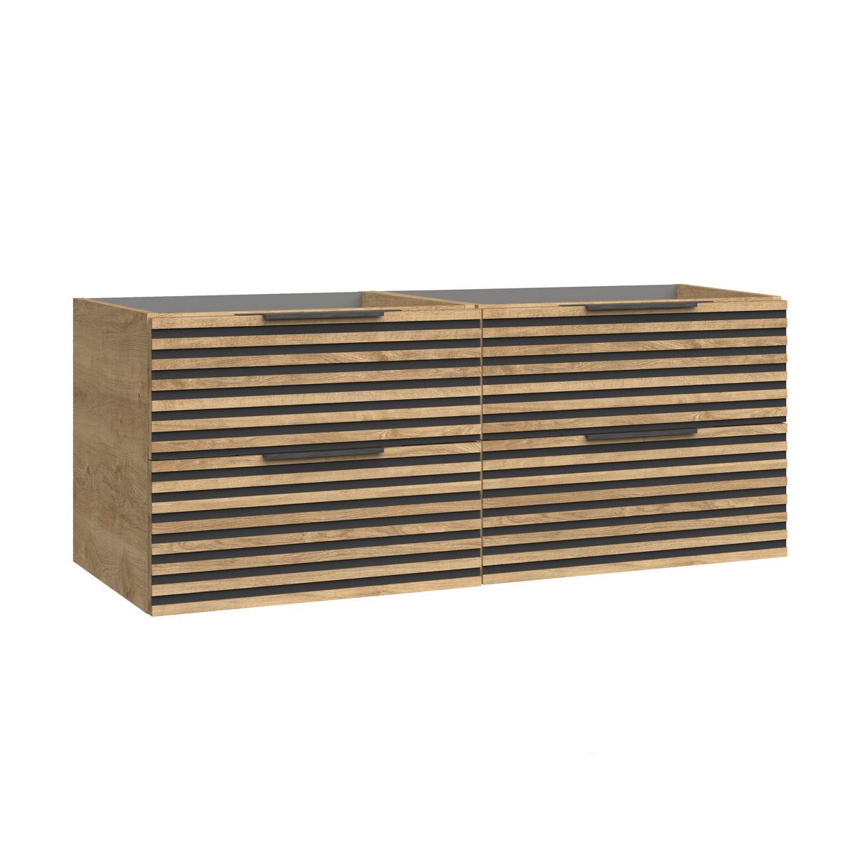 Tenfors Stilja i 120 cm är en rymlig paketlösning som består av två 60 cm-kommoder i en varm valnötsnyans. Kombinationen ger en bred och funktionell badrumsmöbel med massor av förvaring. Fronten har samma distinkta lamellstruktur som kännetecknar Stilja-serien: svart MDF-bas med horisontella lameller i valnöt som tillför djup och rytm till designen. Varje kommod har två fullt utdragbara lådor med GRASS-skenor och metallsidor för mjuk och tyst stängning. I den övre lådan finns småfack för praktisk organisering. Upphängningen är dold, höjd- och djupjusterbar, och monteringen blir enkel och säker tack vare anti-lossningssystemet. Svarta metallhandtag förstärker möbelns moderna karaktär och skapar en snygg kontrast till valnötens naturliga ton.