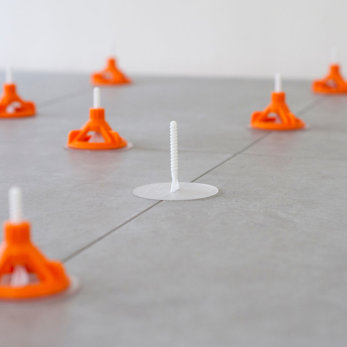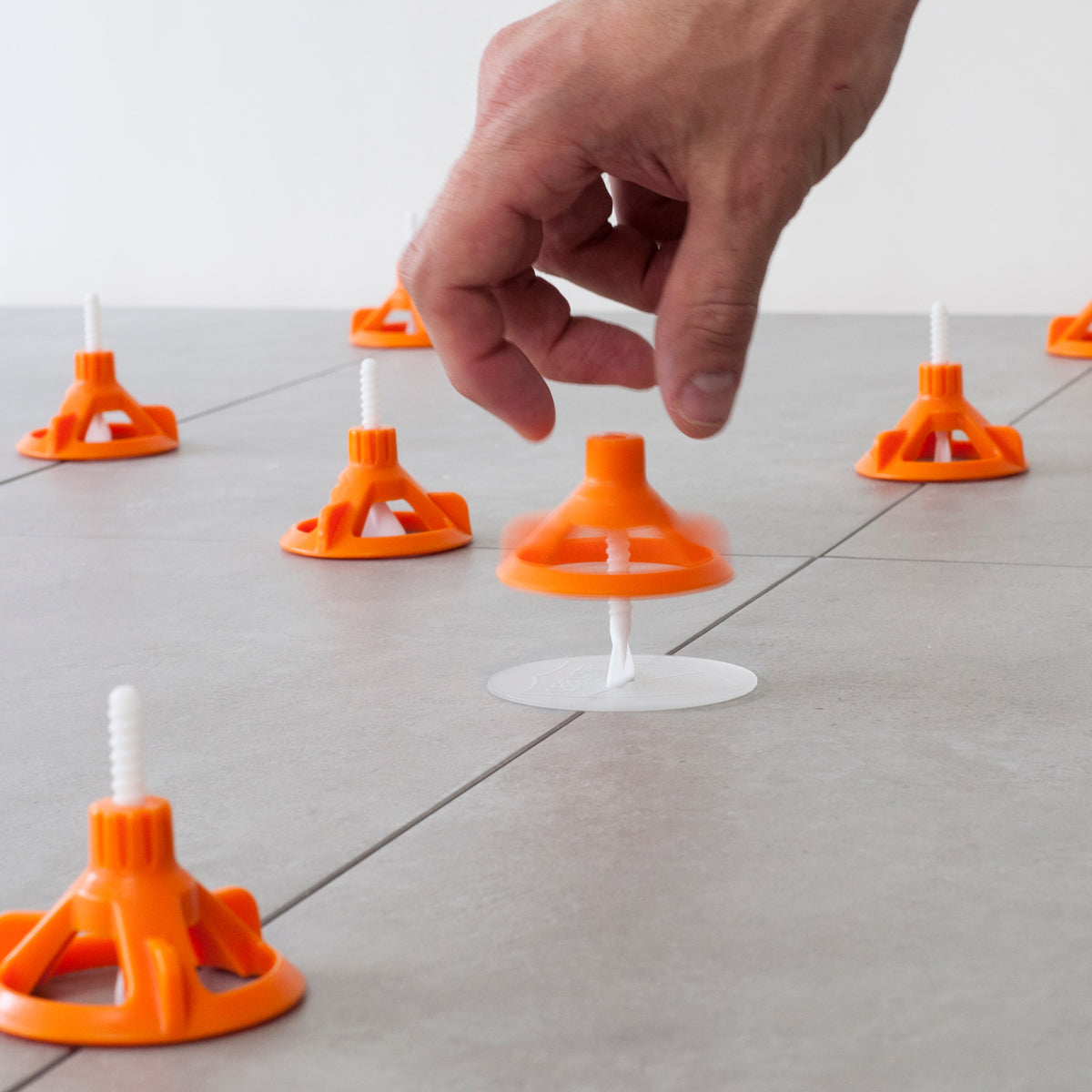 Nivåsystem Spin Level motverkar att fogsprång uppstår vid montering av stora plattor. Med en patenterad konstruktion som gör att nivåhatten automatiskt skruvas ned på nivåskruven med minimal ansträngning är det möjligt att endast med en hand dra åt och efterjustera nivåhatten.
