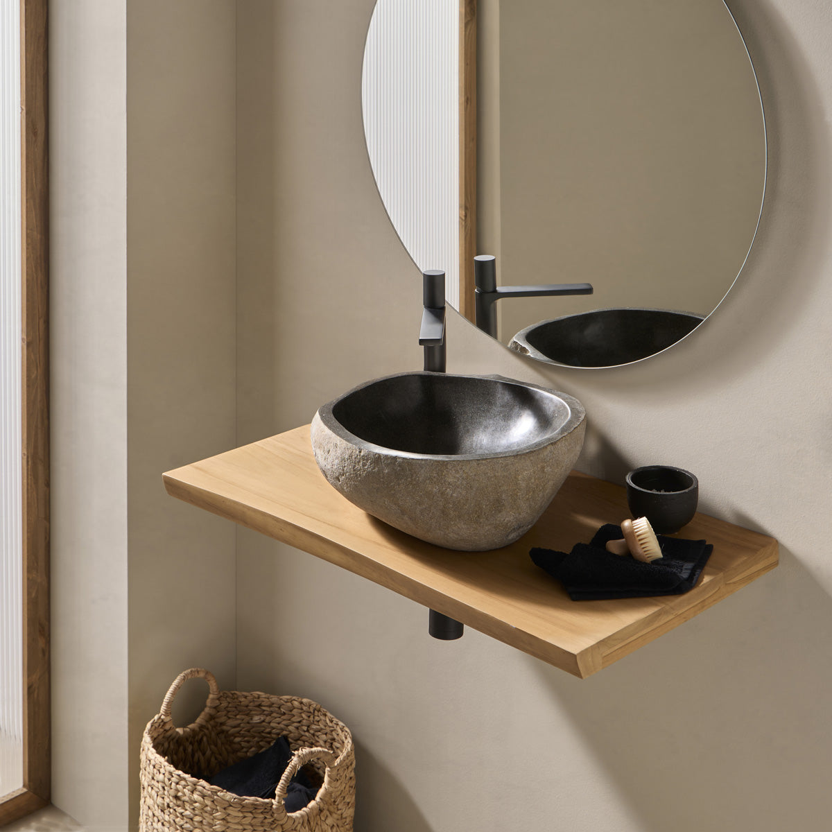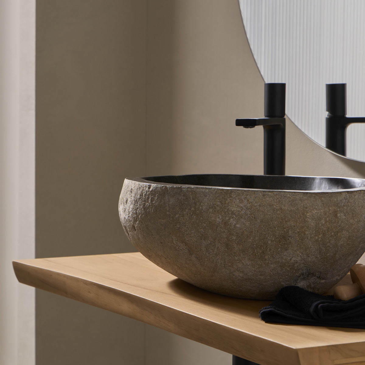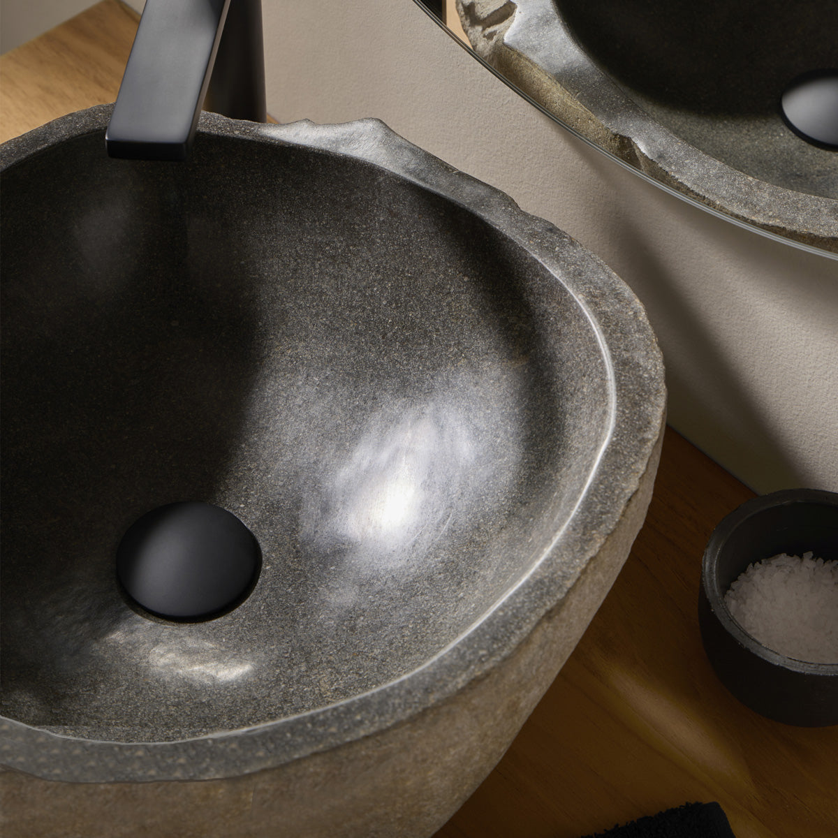 Tvättställ Sjösten är ett exklusivt handbearbetat tvättställ tillverkat av äkta flodsten – en naturprodukt som formats av tid, vatten och naturens krafter. Varje exemplar är utskuret ur ett enda massivt stenblock och har en helt unik, oregelbunden form som ger badrummet en rustik och genuin karaktär. Den yttre, naturligt ruggade strukturen kontrasterar vackert mot den inre, polerade ytan som framhäver stenens naturliga glans och färgspel.