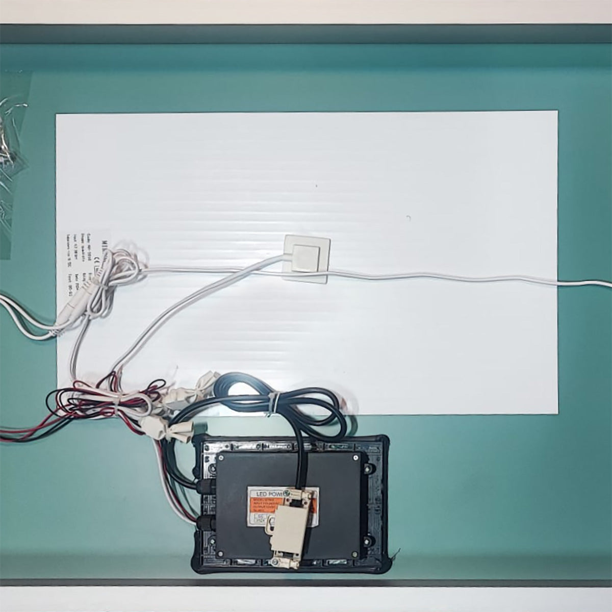 Spegeln levereras med en 90 cm lång elkabel. El-dosans placering kan variera något, men den är alltid centrerad i spegelns nederkant.