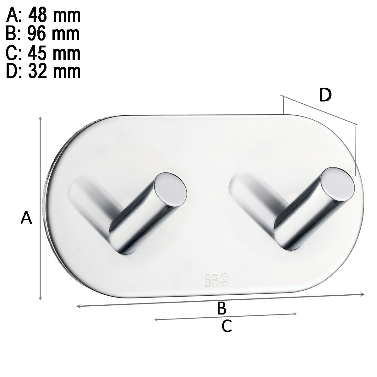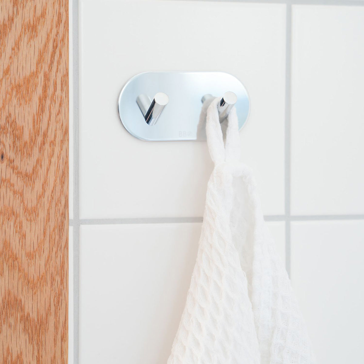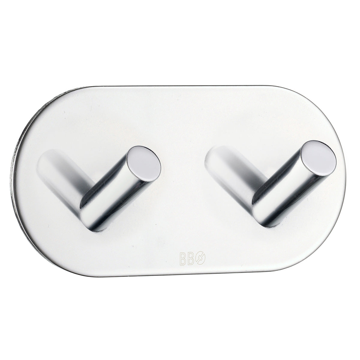 En elegant selvheftende dobbelkrok i krom som kombinerer enkel montering med holdbar kvalitet – perfekt for et stilrent og funksjonelt baderom.