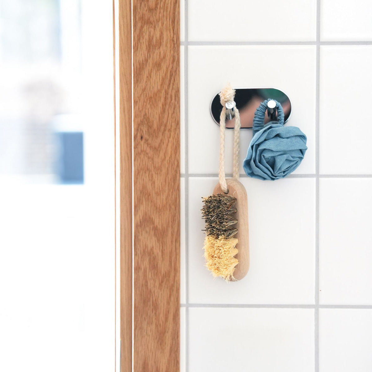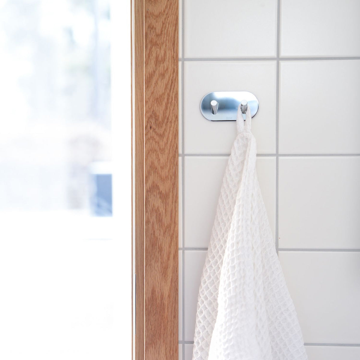 Kroken er laget av rustfritt stål, et slitesterkt og fuktbestandig materiale som motstår rust selv i baderommets fuktige miljø. Takket være den selvheftende 3M-tapen monteres den raskt og enkelt på fliser eller gulvfliser – en stabil og holdbar løsning uten bruk av verktøy. Enkel, elegant og perfekt for moderne baderom.