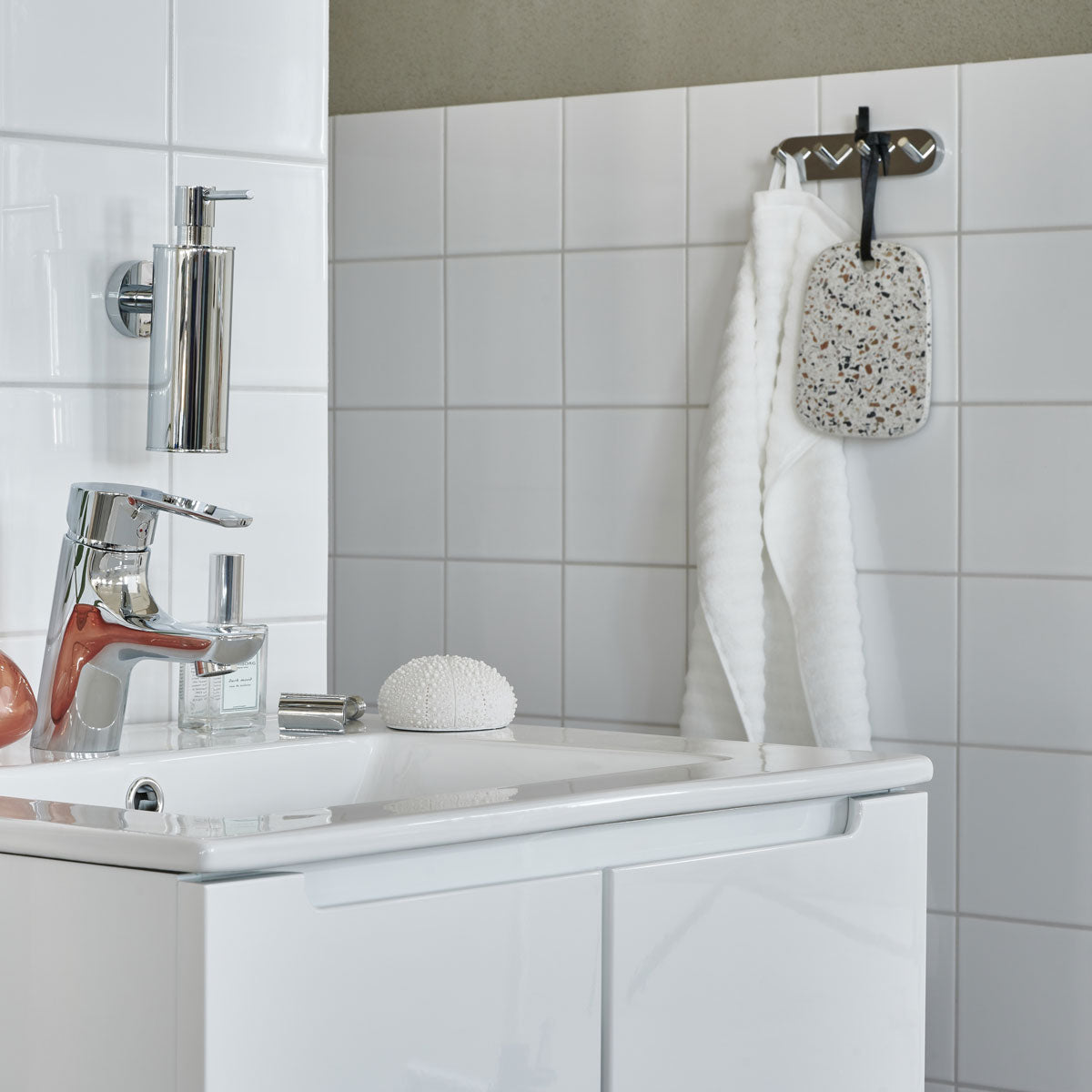 Baderomsserien HOME preges av skandinavisk design der form, funksjon og kvalitet går hånd i hånd. En elegant firkrok i krom som gir både orden og stil – et perfekt supplement til et gjennomført og moderne baderom.