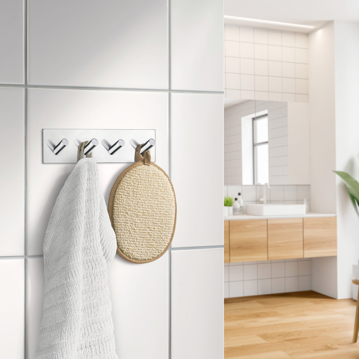 En elegant selvheftende firkrok i krom som kombinerer enkel montering med moderne design – perfekt for et stilrent og velorganisert baderom.