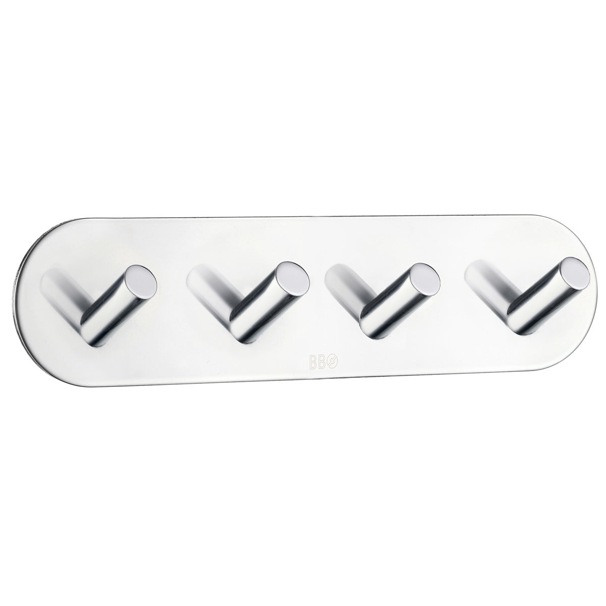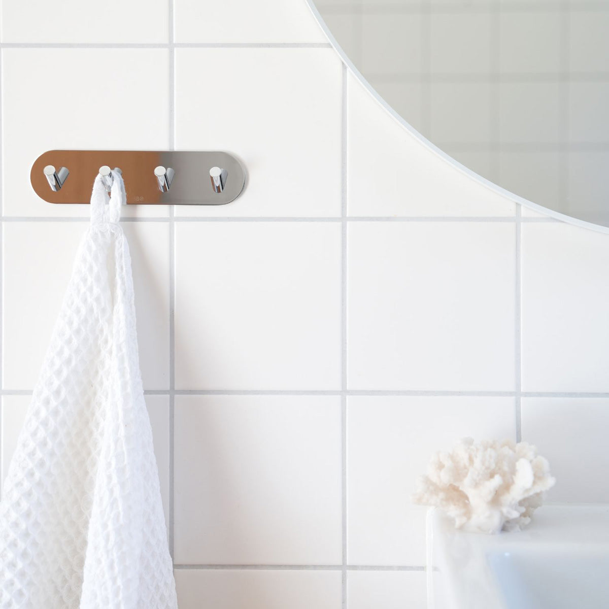 Kroklist, 4 kroker Smedbo i blank krom er en stilren og praktisk løsning for deg som ønsker orden og oversikt på baderommet uten å måtte bore i veggen. Den selvheftende bakplaten med avrundede former gir et mykt og moderne uttrykk, mens den forkrommede overflaten reflekterer lyset og gir baderommet en elegant finish. Perfekt for håndklær, morgenkåper eller annet baderomstilbehør.