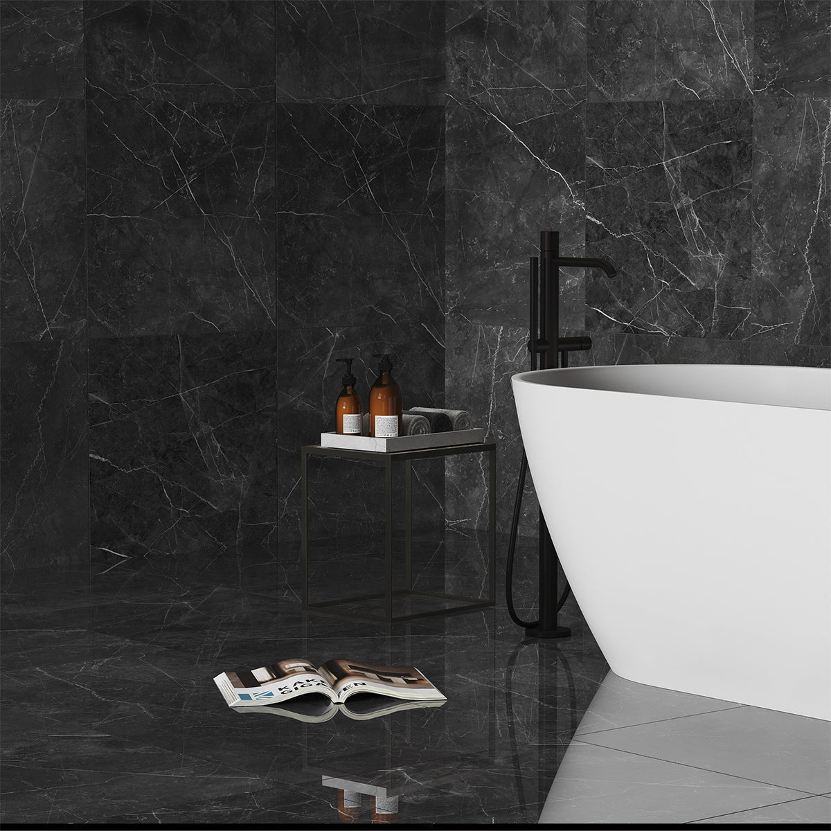 Klinker Venatto är en imponerande granitkeramik som imiterar den dramatiska skönheten hos svart marmor med subtila, vita marmoreringar. Med en blankpolerad yta och rektifierade kanter, ger Venatto ett sofistikerat intryck som för tankarna till lyx och elegans.