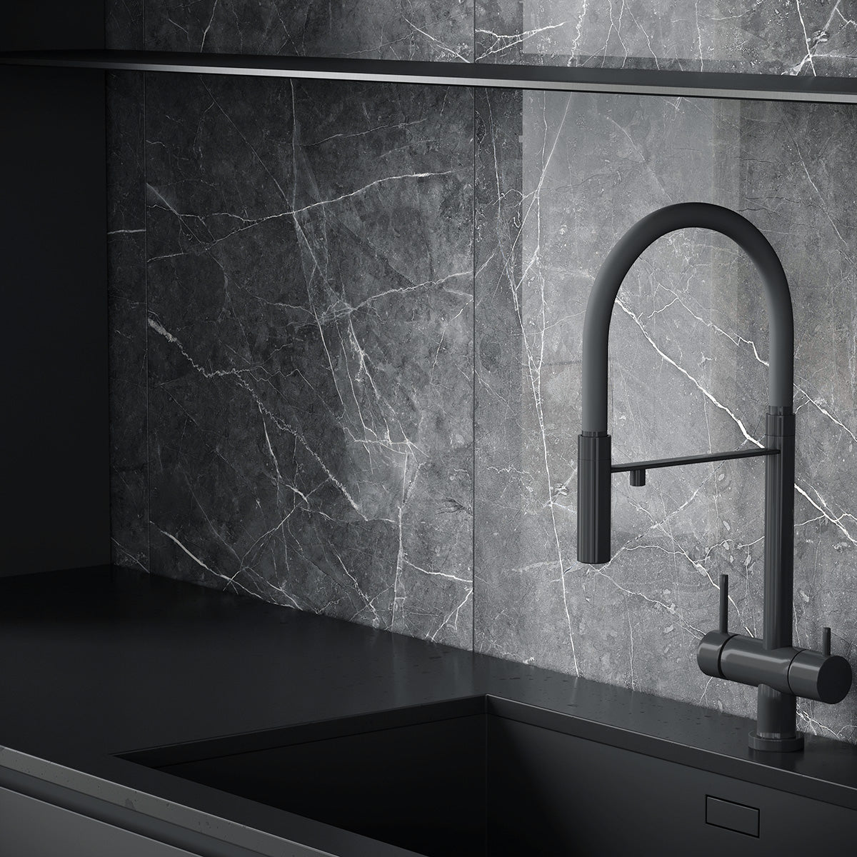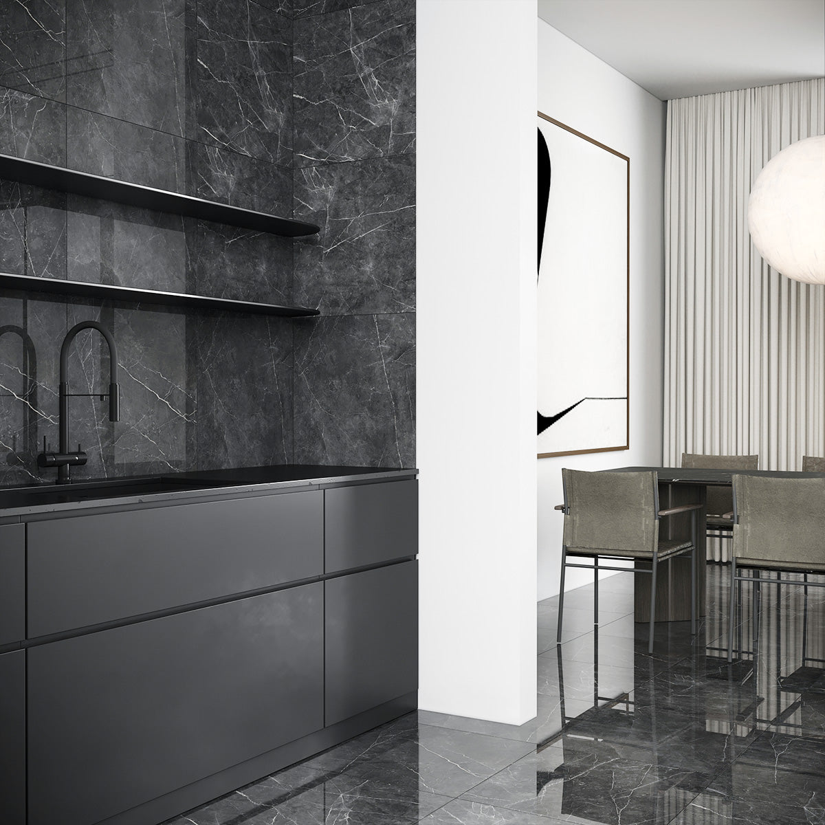 Venattos blanka yta ger en elegant kontrast på väggar, vilket skapar en storslagen atmosfär i utrymmet. Tack vare sin motståndskraft mot fläckar och vatten, är Venatto en perfekt val för kök, badrumsytor och duschväggar.