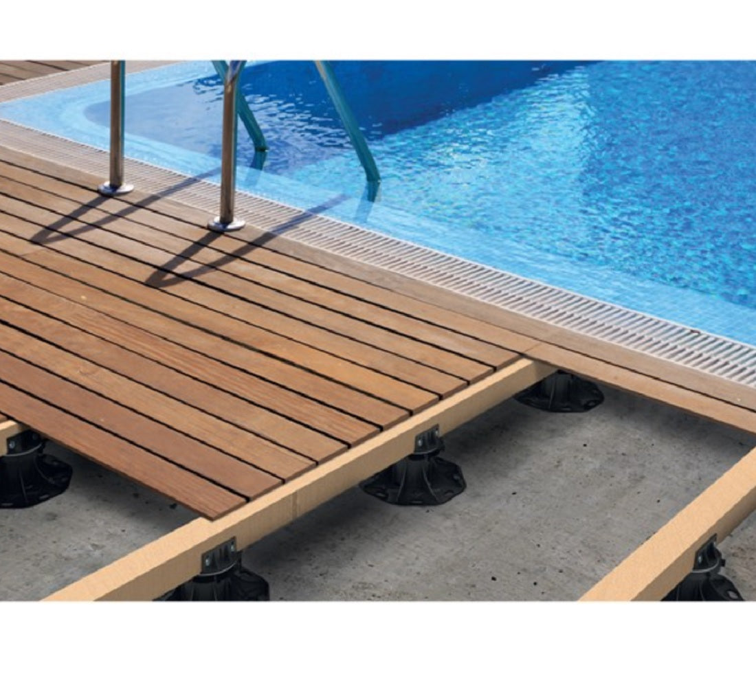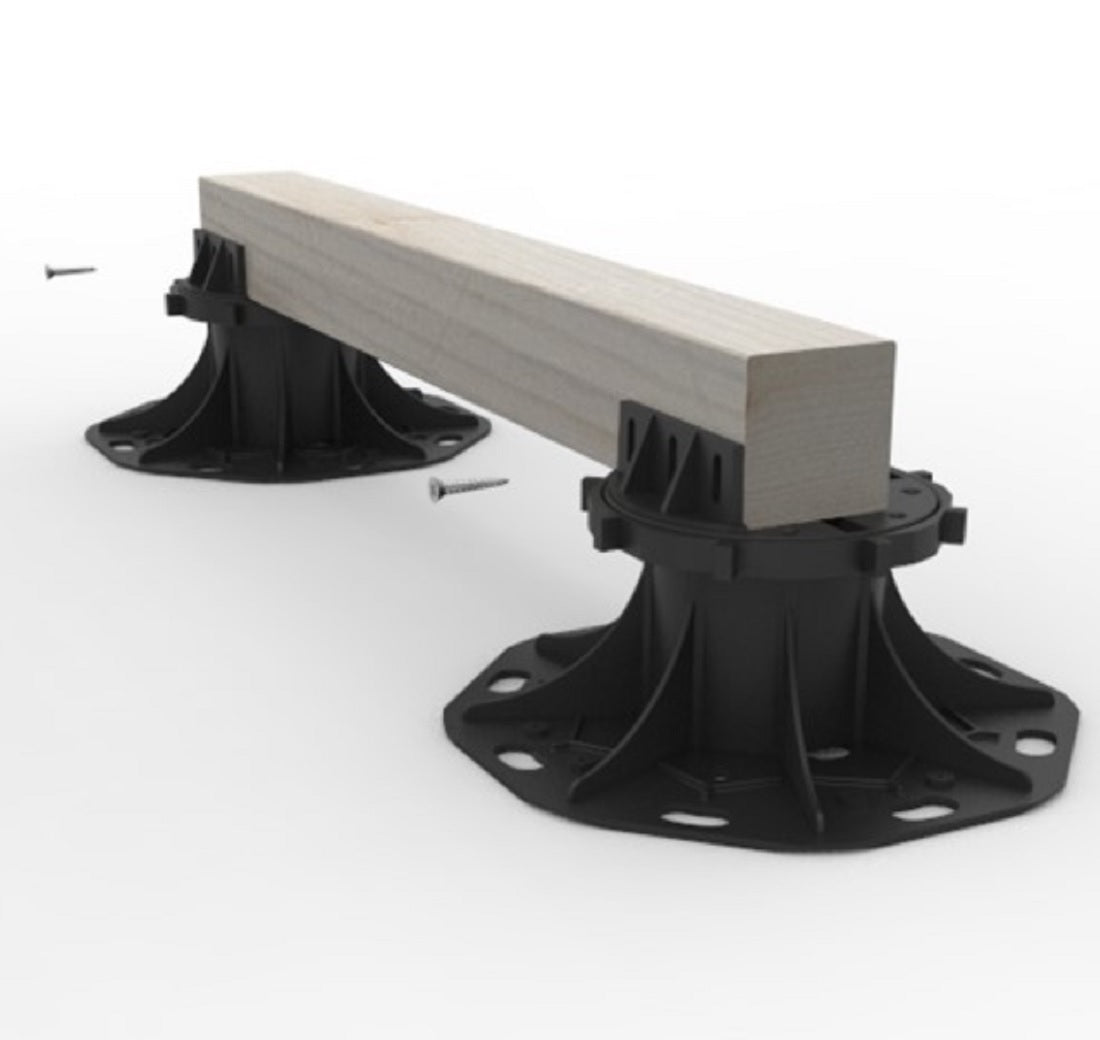 Parallellfäste till terassfot som kan användas tillsammans eller var för sig. Kan användas för att hålla bjälkar eller skenor på plats som fundament till ett upphöjt golv.