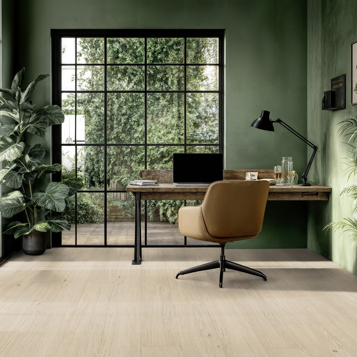 Ytan är behandlad med Embossed-in-Register-teknologi, vilket innebär att träets struktur exakt följer ådringen i dekoren. Det skapar en äkta, taktil känsla med både synliga och känn¬bara detaljer. Golvet har dessutom låg statisk laddning, är enkelt att rengöra och kräver minimalt underhåll – endast torrmoppning eller lätt fuktig trasa vid behov.