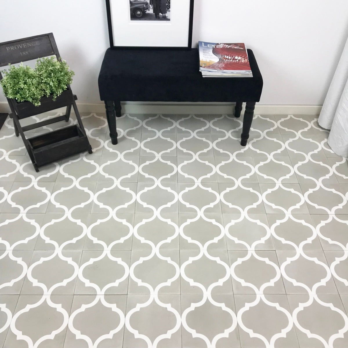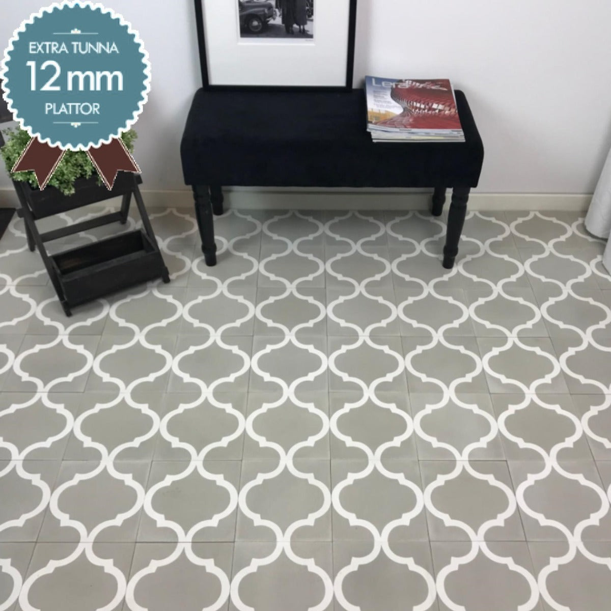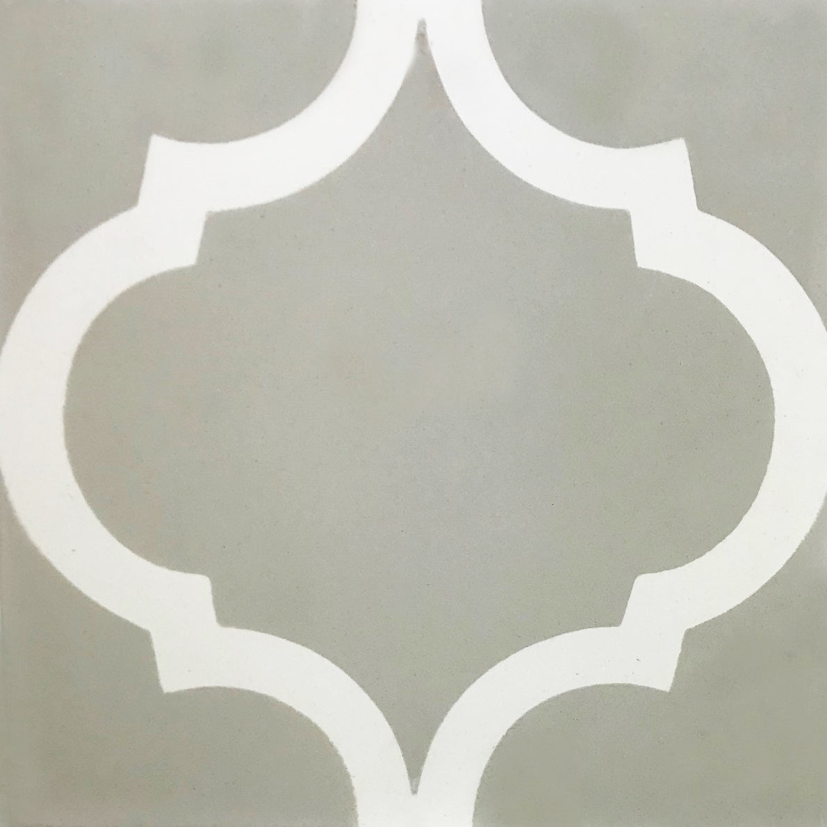 Marockanskt kakel Zawat Grey 20x20 (12mm) är en handgjord cementplatta i grått och vitt. Klassiskt lykt-mönster som ger en tidlös och slående yta.