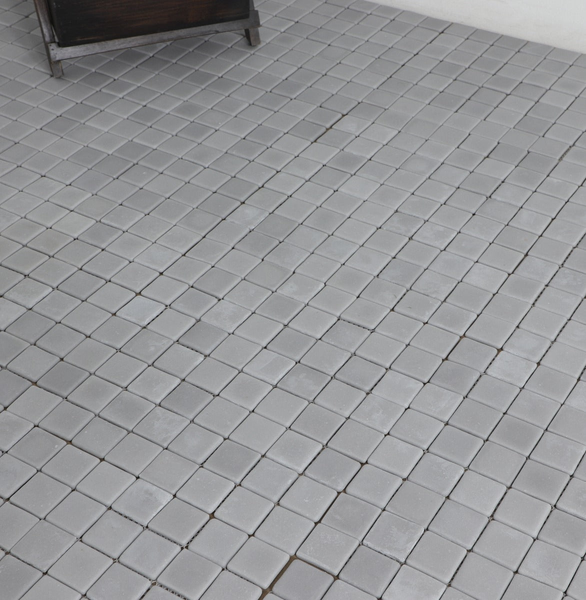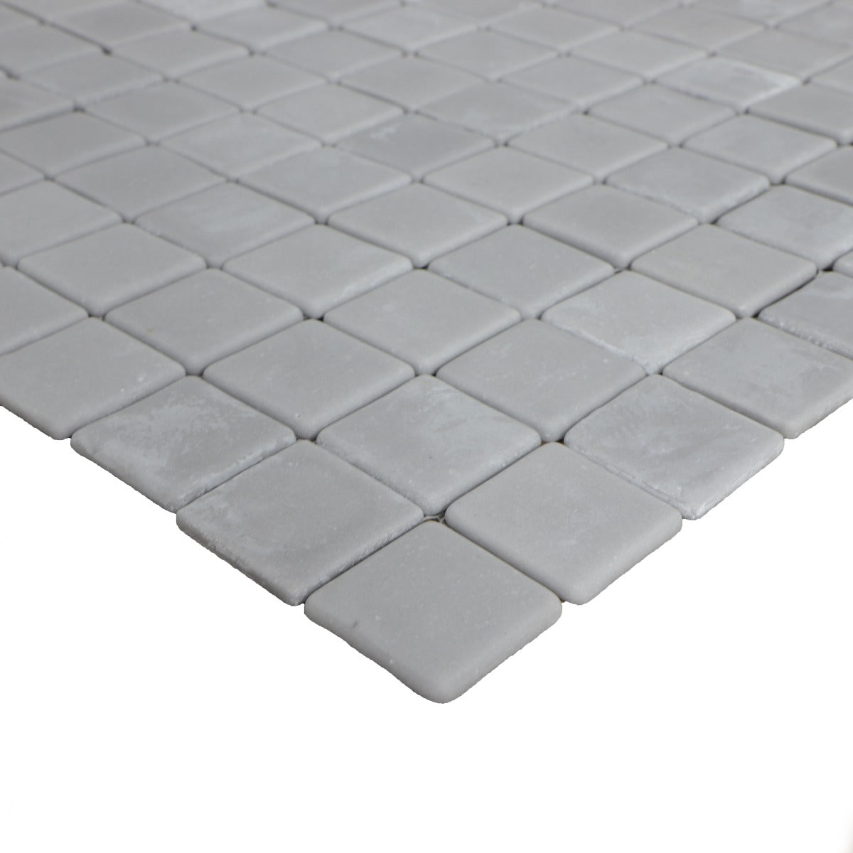 Mosaik Vasa Kvadrat Grå är en ljust grå glasmosaik med matt yta och mjukt rundade kanter. En rustik men ändå elegant mosaik som ger en lugnande spa-känsla. Färgen är varierande vilket ger en levande, naturlig yta så att mosaiken känns som sten även om den faktiskt är gjord av glas, ungefär som glas som slipats mjuk av havets vågor.