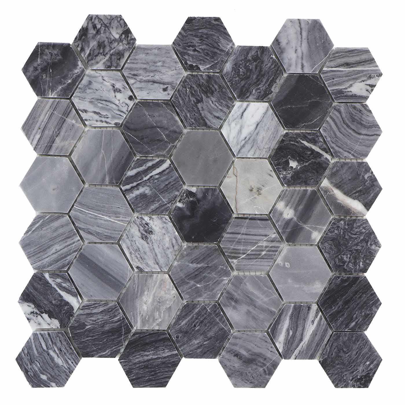 Mosaik Hexagon Marble Grey är en elegant, grå marmormosaik av hög kvalitet med hexagon-formade mosaikbitar. Kan användas till både golv och väggar i kök, badrum, entré eller finrum.. Finns även som vanlig mosaik.