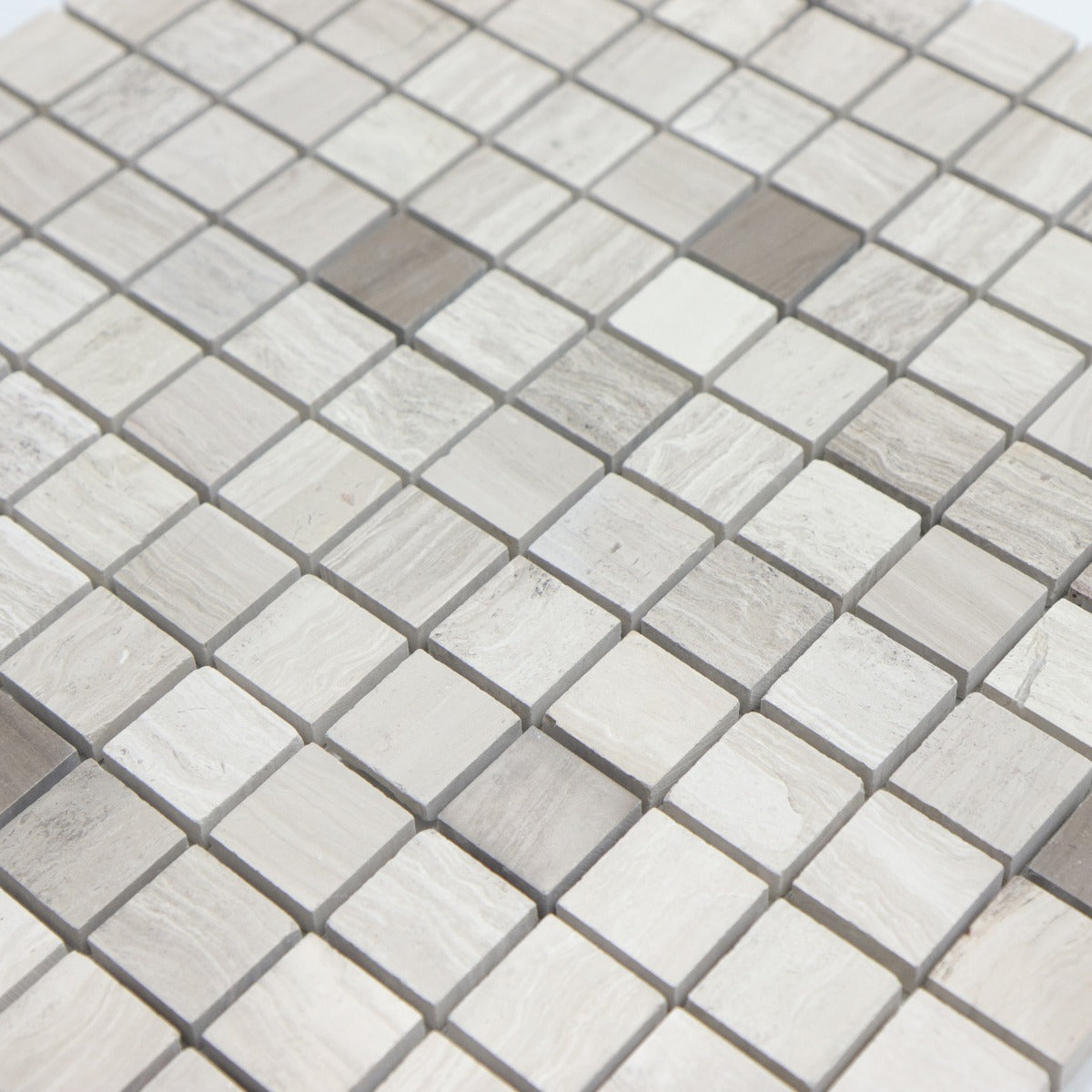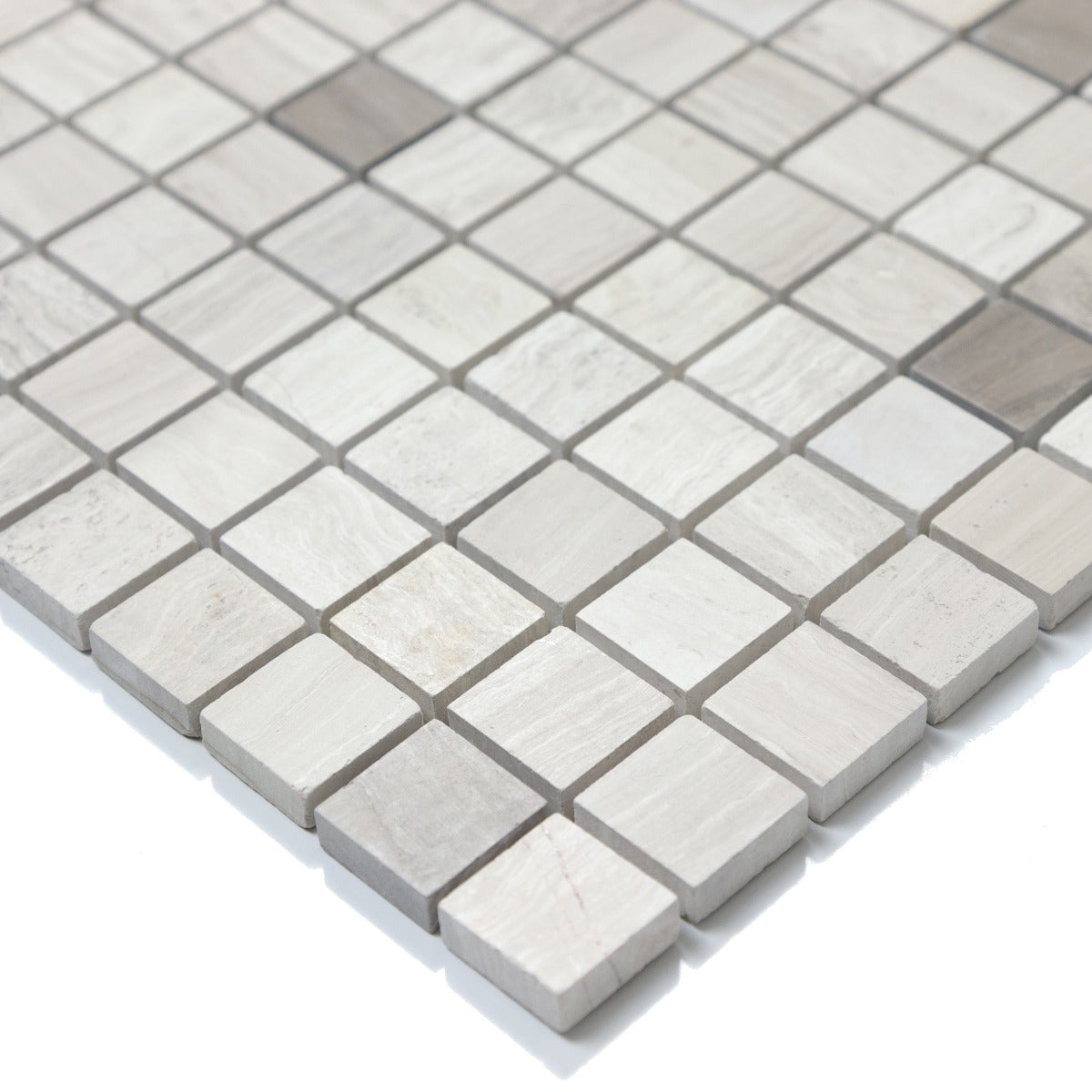 Kan användas till både golv och väggar i till exempel kök och badrum. Varje mosaik mäter 23x23 mm och sitter monterade på pvc-nät i storleken 300x300 mm.