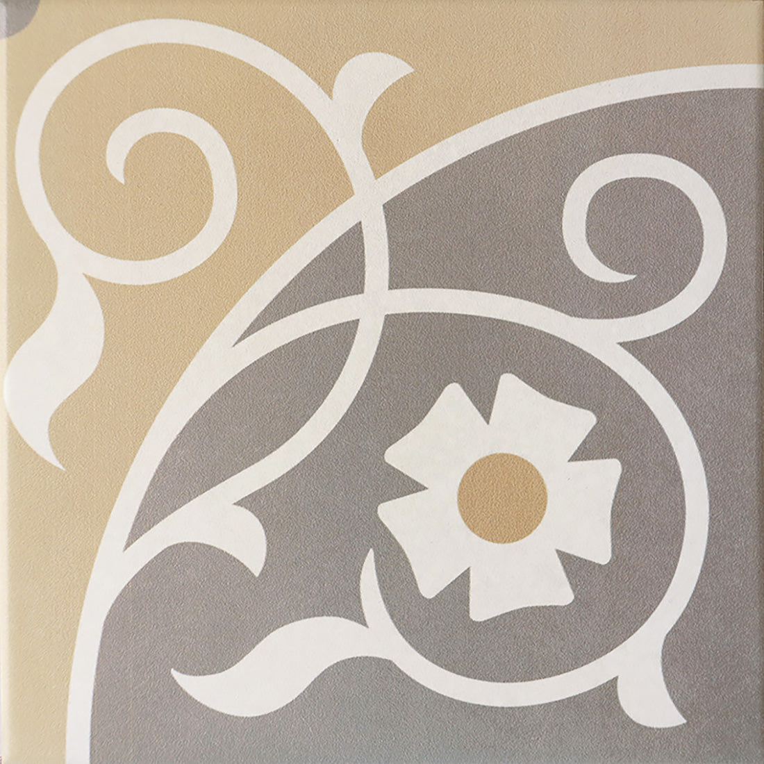 Klinker Atelier Clara Matt 20x20 är en elegant dekorplatta i serien Atelier, inspirerad av sekelskiftets klassiska mönster. Plattan har en varm färgskala i gul, beige och grå toner med mjuka, svängda former och blomdetaljer som skapar ett levande uttryck. Den matta ytan ger en autentisk känsla och påminner om traditionella cementplattor, men tack vare att den är tillverkad av slitstark granitkeramik får du alla moderna fördelar som hög tålighet, lång livslängd och enkel skötsel.