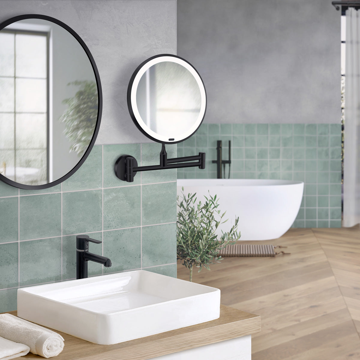 Speilet er laget av rustfritt stål med en eksklusiv matt svart finish som passer perfekt i moderne baderom. Den doble, bevegelige armen gir fleksibel plassering og kan enkelt foldes inn mot veggen når den ikke er i bruk. Sminkespeilet er utstyrt med oppladbart batteri og lades enkelt via USB, slik at du slipper synlige kabler og komplisert elektrisk installasjon.