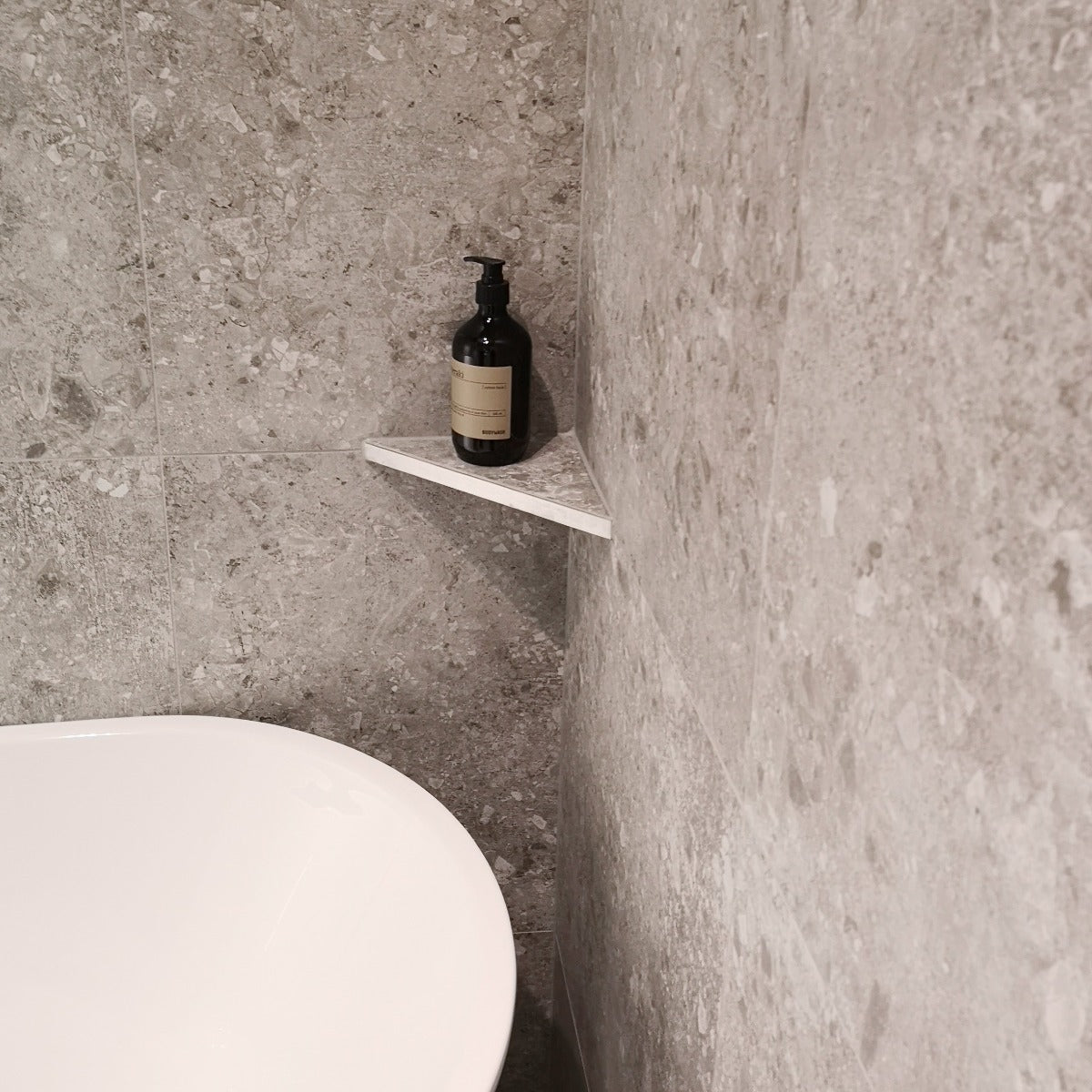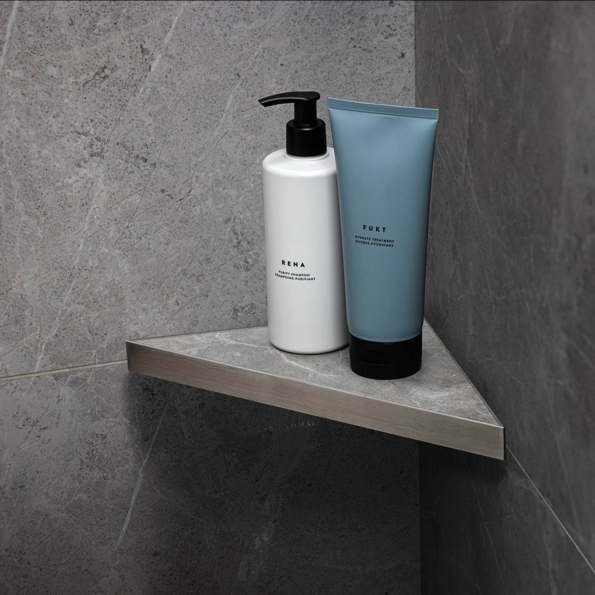 Duschhylla Tile In Brushed är en elegant duschhylla för montering med keramiska plattor i hyllan.