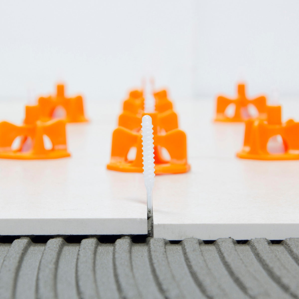 Tenfors Nivåskruv 1,5mm 250st är nivådistanser med skruvtopp som används för att få uniform fogbredd på 1,5 mm samtidigt som nivåskillnad mellan kakel och klinker utjämnas.