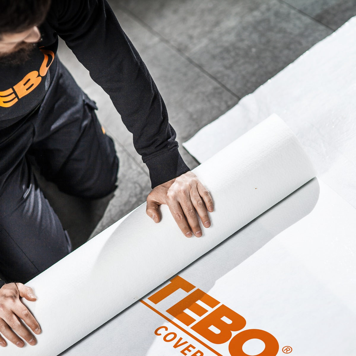 Golvskydd av nonwoven duk. Ovansida av vätsketät PE-film. Självhäftande undersida som ger en halksäker yta och ett optimalt grepp, utan att klibba fast mot underlaget.