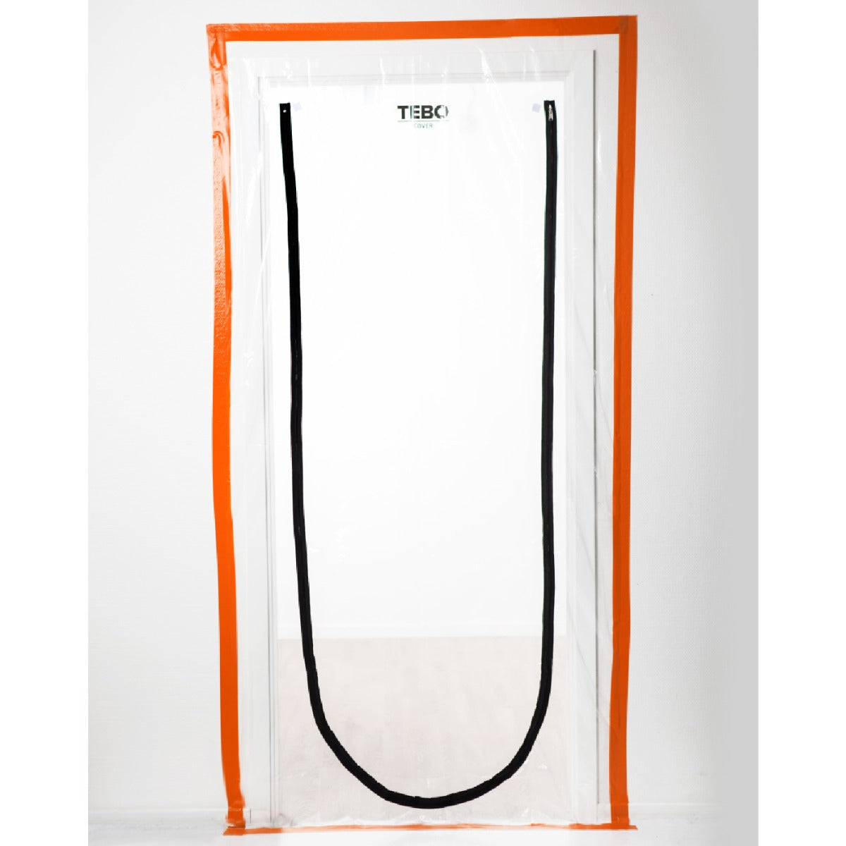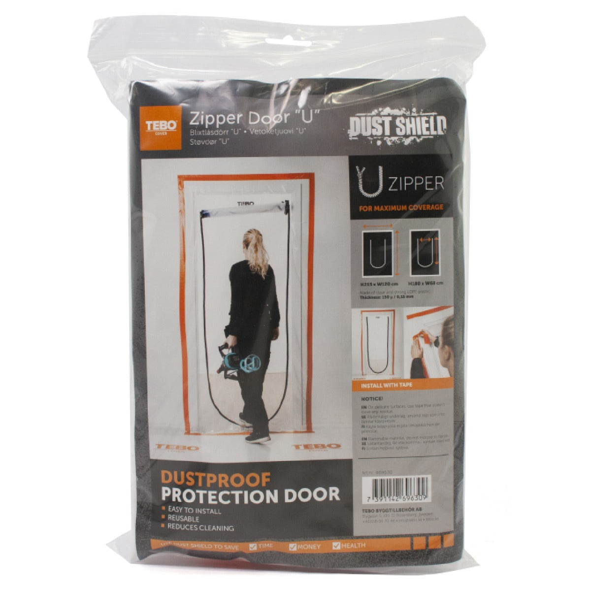 Dammskydd av HDPE-plast för täckning av dörröppningar vid t.ex. renovering. "U"-format blixtlås som gör att det blir tätt i nederkant.