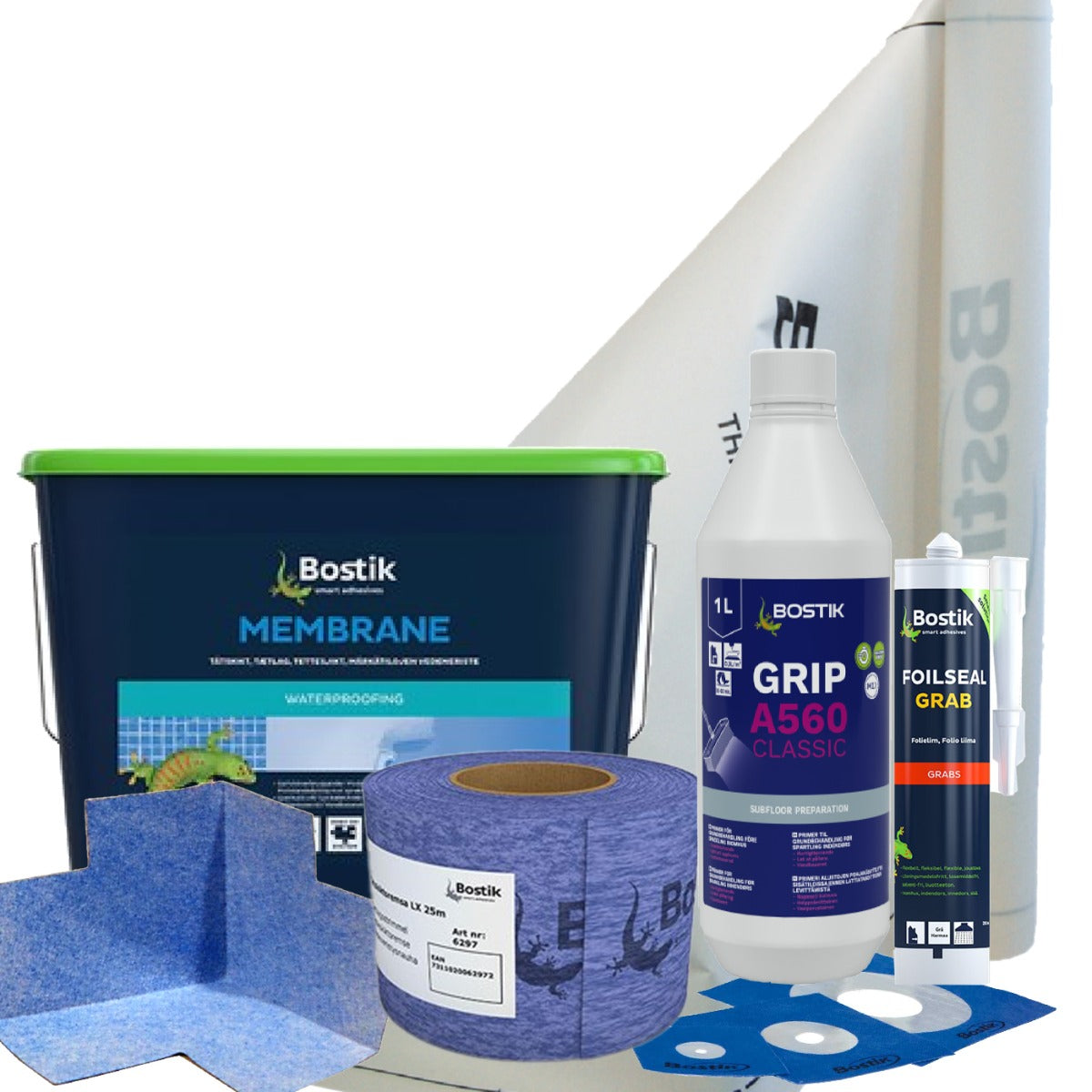 Materialmängden är beräknad för användning till golv upp till 4 m². Paketet kan kompletteras med andra produkter som ingår i Bostiks tätskiktssystem, såsom innerhörn eller brunnsmanschett. Fix och fog beställs separat