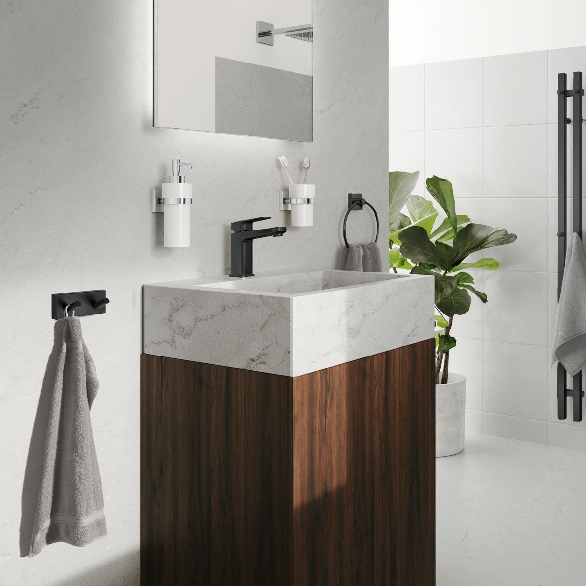 Baderomsserien HOUSE kjennetegnes av skandinavisk design med rene linjer og harmoniske proporsjoner. Den firkantede platen fremhever de myke, runde formene og skaper en tydelig balanse mellom funksjon og estetikk. En rustfri dobbelkrok i matt svart – perfekt for et stilrent og velplanlagt baderom.