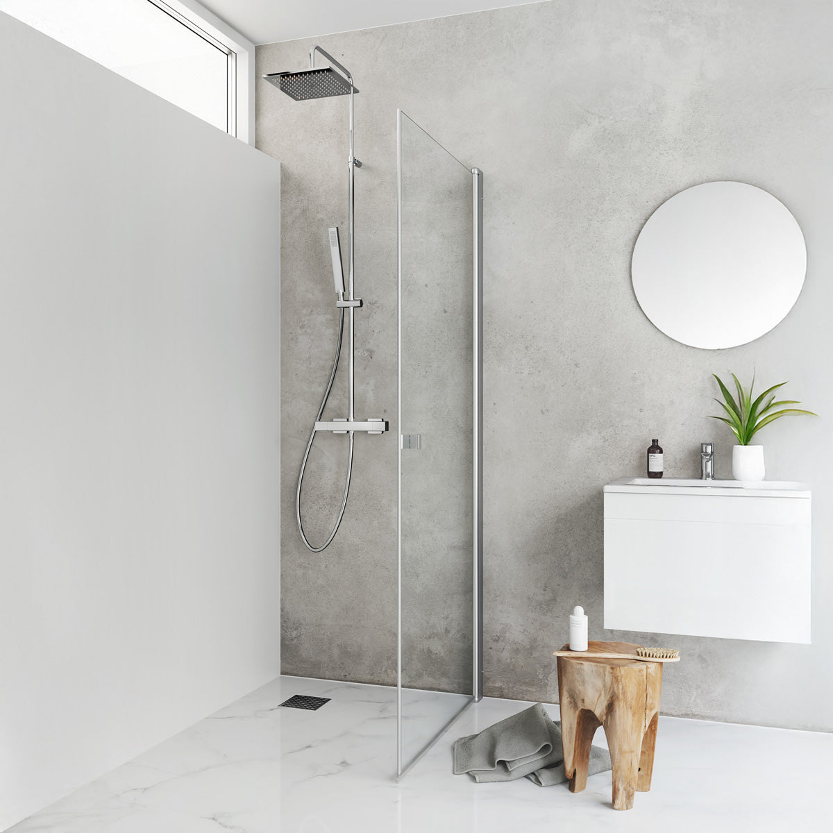 Upptäck Hafa Igloo Pro Rak Duschdörr i klarglas och elegant aluminiumprofil – en stilren lösning för din duschhörna. Denna högkvalitativa duschdörr är särskilt utformad för att spara plats och passar perfekt även i mindre badrum tack vare sin fällbara design. När duschen inte används, kan dörren enkelt fällas in i duschhörnan, vilket frigör värdefull yta.