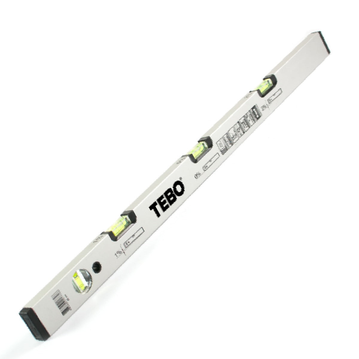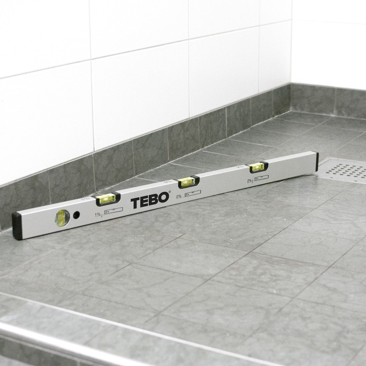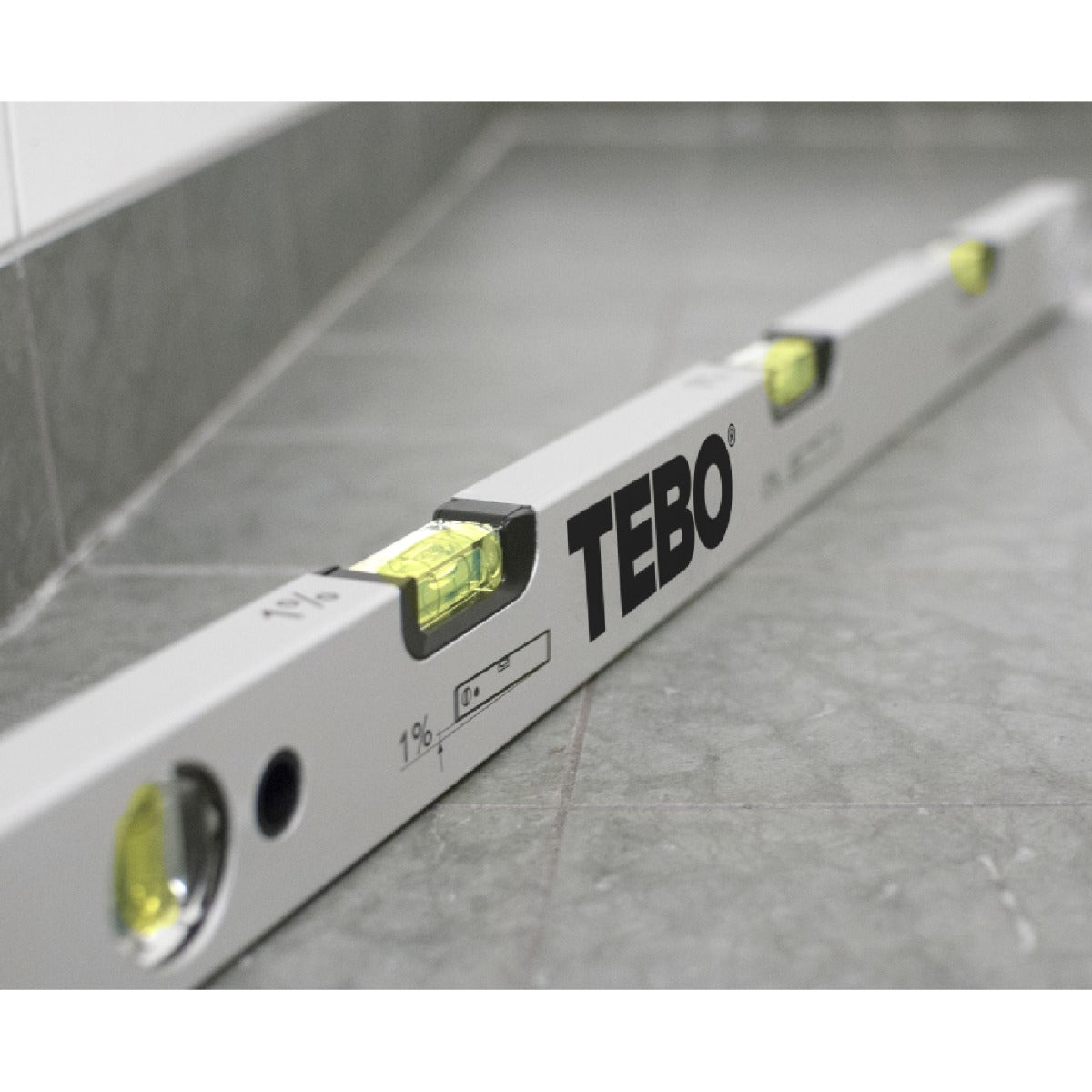 Fallvattenpass, 800 mm, aluminiumprofil med 4 st okrossbara libeller för våg och lod, samt 1% och 2% fall med hög genomskinlighet.