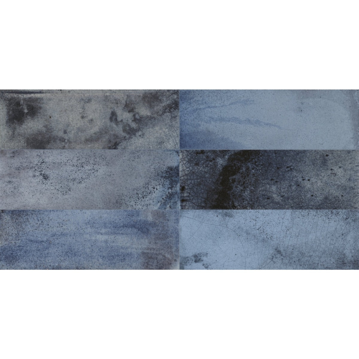 Veggflis FS Raku Blue 20x40 er en blå veggflis med grå og svarte elementer med sprekker. Selve flisen er laget av hvit leire og glasuren er påført i såkalt Raku-teknikk. Hver flis er delt inn i seks deler, med en spalte i mellom som fuges samtidig med fuging mellom flisene.
