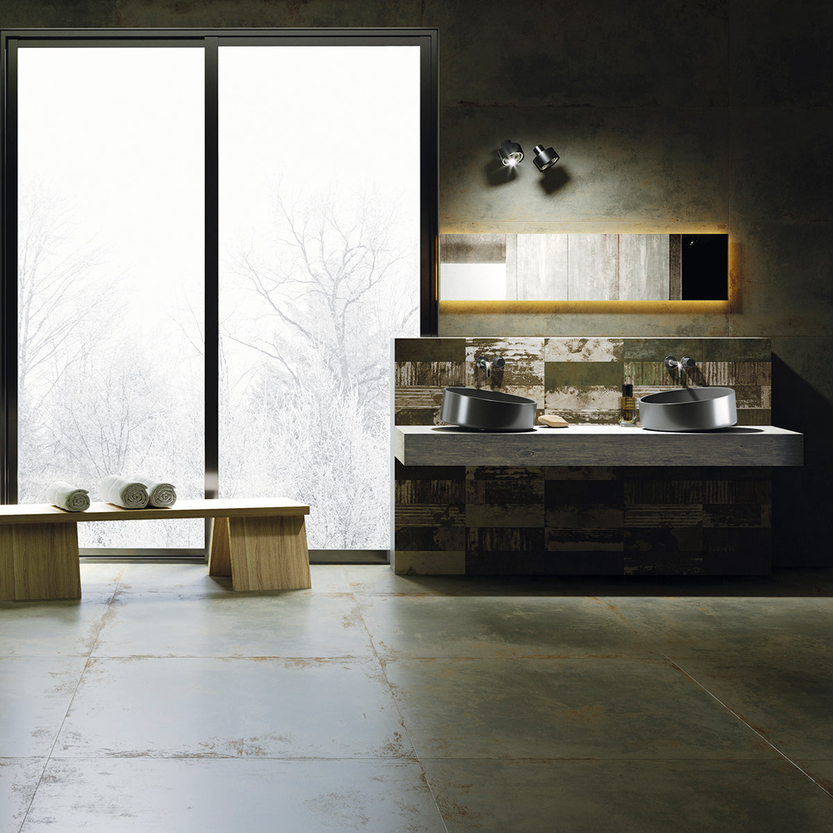 Flamed tar industrins råa estetik och förvandlar den till något förfinat och elegant. De metalliska inslagen i designen, kombinerade med den rostiga patina som löper över plattornas yta, ger ett intryck av naturlig åldrande och rustik charm. Den mörkt gröna färgen förstärker dessa industriella inslag och skapar en perfekt balans mellan det råa och det sofistikerade.
