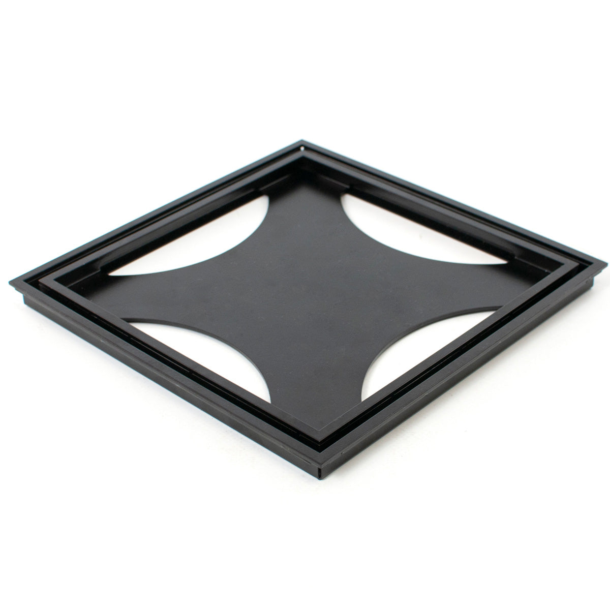 Stilren matt svart, pulverlackerad golvbrunnssil med ram för montering av klinker.