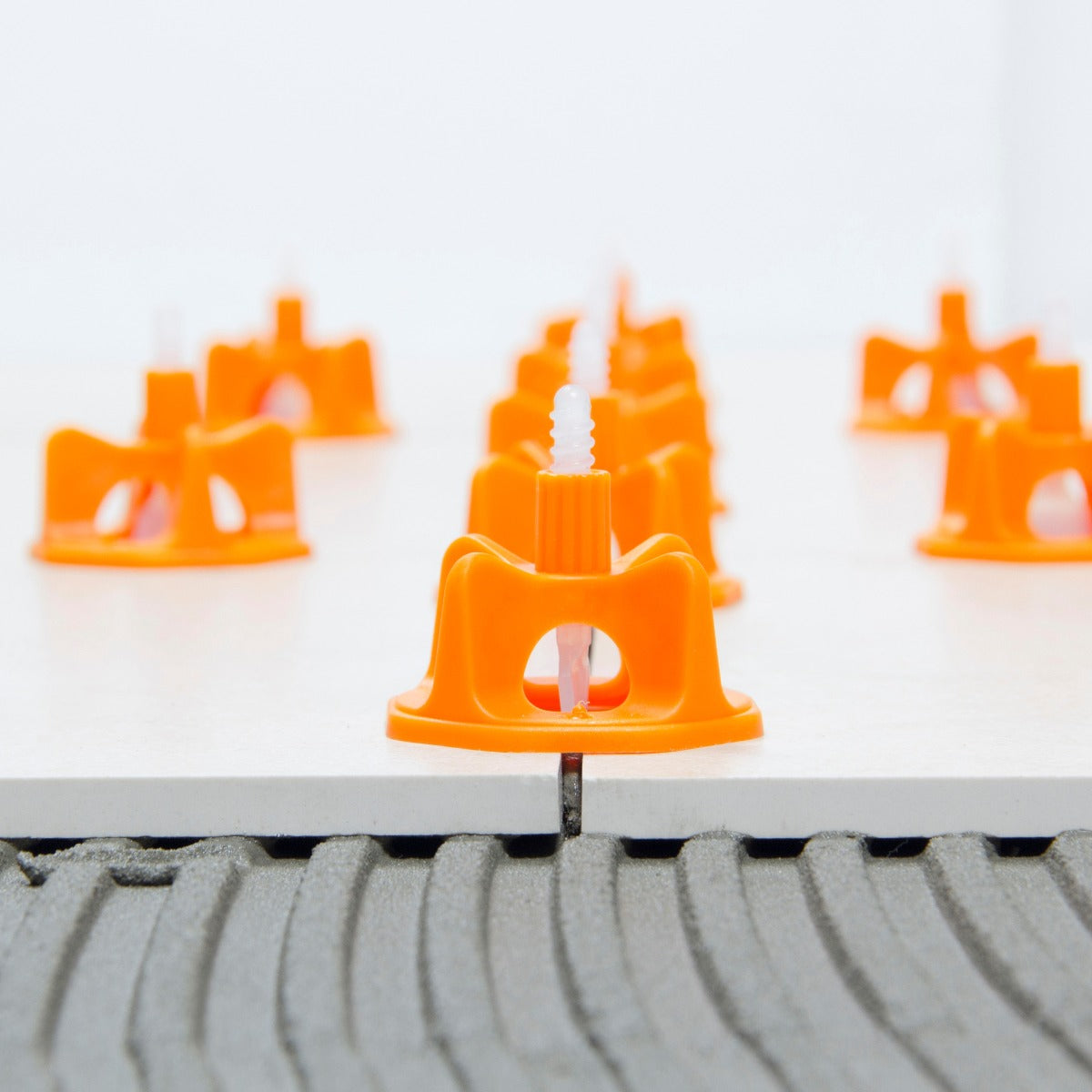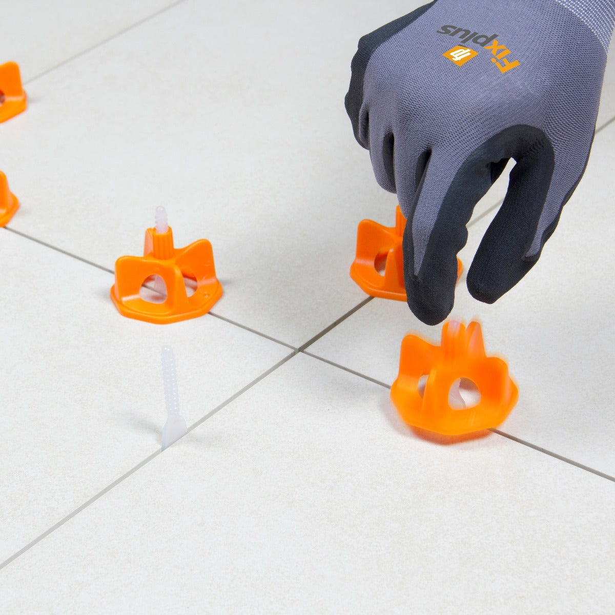 - Påfør lim på flisen, plasser nivelleringsklips mot siden av flisen, la basen gli under flisen. Mengde nivelleringsklips som er nødvendig avhenger av størrelsen på flisen som brukes, standard er en nivelleringsklips pr 20 cm.