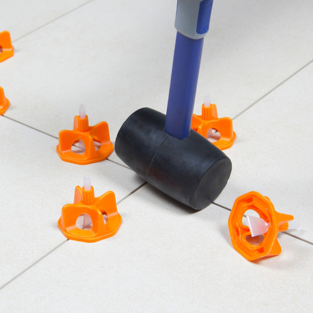 - Når limet har tørket, fjernes skruhettene og den utstikkende delen av nivelleringsklipsen kan brytes av. Bruk en gummihammer eller fot, hver nivelleringsklips har et knekkpunkt som letter fjerning. Pass på at slaget kommer rett fra siden og ikke i kompresjonsretningen. Når alle delene dine er fjernet, samle skruhettene og rengjør dem slik at de kan gjenbrukes.