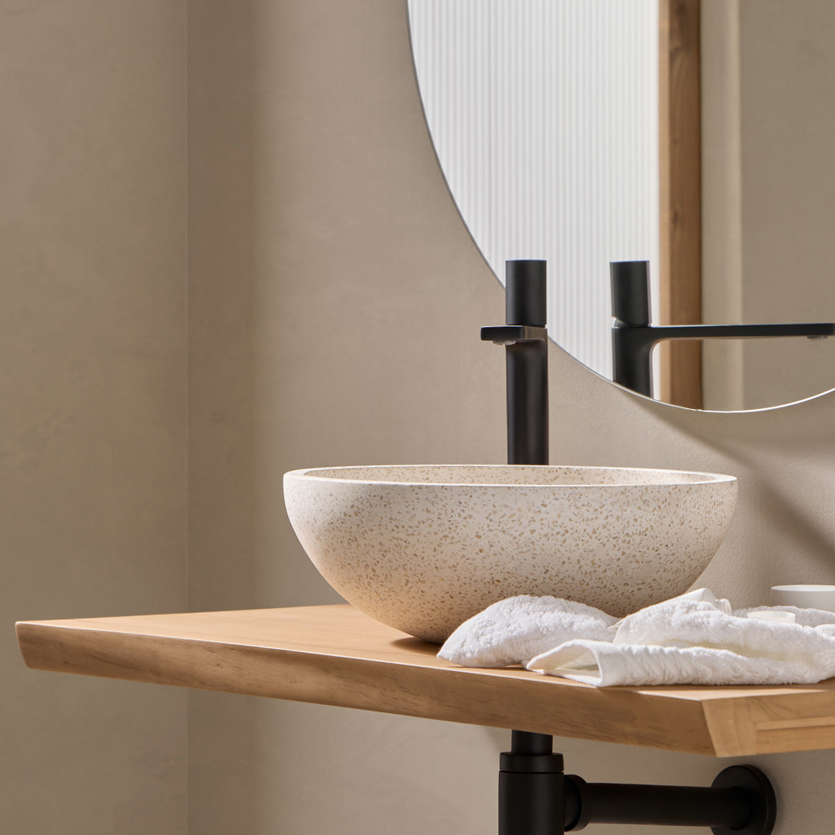 Varje tvättställ i serien Grano är unikt tack vare terrazzo-materialets naturliga variationer. Den varma beige tonen och de subtila marmorkornen skapar ett harmoniskt spel av färg och struktur som förhöjer intrycket i både klassiska och moderna badrum.