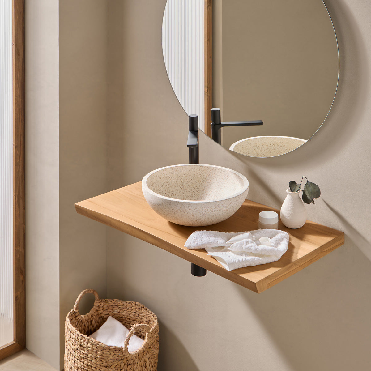 Tvättställ Grano Beige kombinerar terrazzo-materialets klassiska charm med nutida design. Den varma färgtonen och den runda formen gör tvättstället till ett elegant komplement till bänkskivor i trä, natursten eller komposit. Kombinera gärna med en tvättställsblandare i krom, borstad mässing eller svart för en sofistikerad och enhetlig helhet.