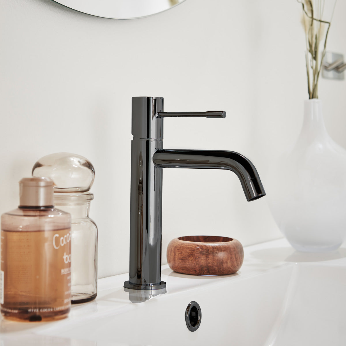 Hafa Fine är en elegant tvättställsblandare i högkvalitativ mässing som kombinerar stilren design med smarta funktioner. Blandaren finns i både låg och hög modell, vilket gör den anpassningsbar till olika tvättställ och badrumsstilar. Med färgval som krom, matt svart, matt borstad mässing och borstad svartkrom kan du enkelt matcha blandaren med övrig badrumsinredning. Tack vare den avancerade ytbehandlingen behåller blandaren sin vackra färg och finish över tid, vilket gör den till ett hållbart och estetiskt tilltalande val.