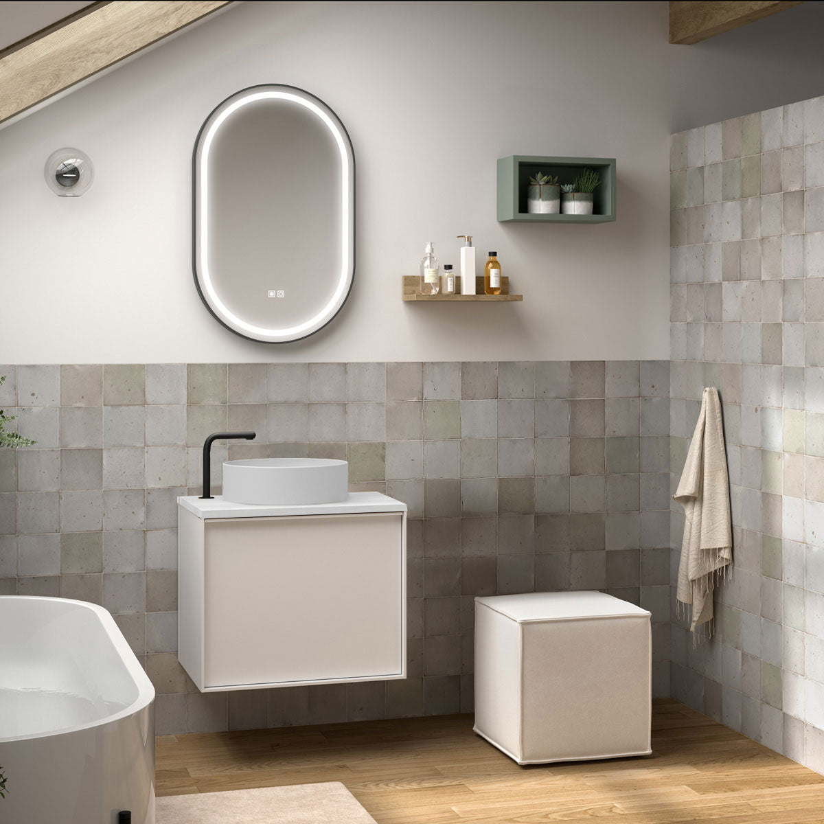 Tenfors bänkskiva finns i flera stilrena nyanser – vit matt, svart matt, valnöt och ek – vilket gör det enkelt att matcha med olika kommoder, blandare och badrumsstilar. Utöver 60 cm finns bänkskivan även i bredderna 80 cm, 100 cm och 120 cm, så att du kan anpassa lösningen efter ditt badrums storlek och behov.